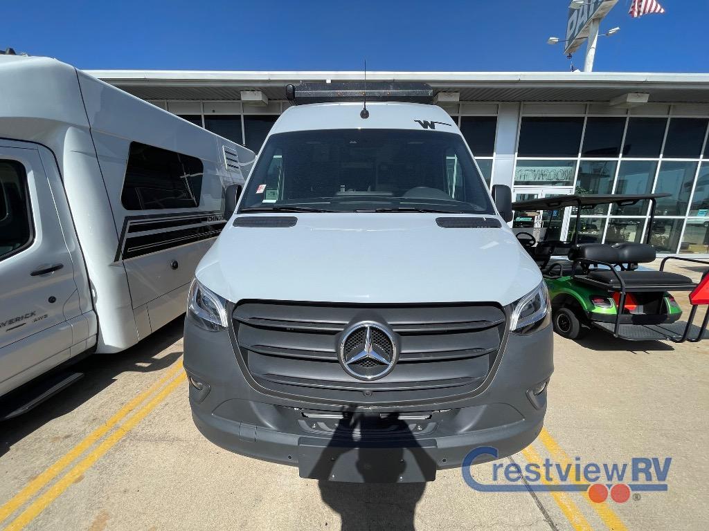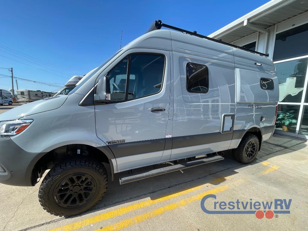 Winnebago Revel Sport Class B diesel motorhome 44N highlights: Power Lift Bed, Wet Bath/Gear Closet, Fold-Down Outside Table, Overhead Cab Shelf, All-Wheel Drive. Adventure is just around the corner with this camper van! Once you arrive at your destination, you can make a quick lunch on the single induction cooktop that is stored in a drawer so you can have more counter space when you need it. The swivel cab seats and bench seat with a removable pedestal table provide a place to enjoy your meal at before you head outdoors. An all-in-one gear closet and wet bath will let you freshen up when you return, and the power lift bed with a gear garage below will provide a great night's rest. And if you're needing additional sleeping space, just choose the optional front cab air mattress! Go off-grid and off the beaten path with the Revel Sport Class B diesel motorhome by Winnebago. There is a 5kWh EcoFlow battery, 210-watts of solar power, plus a 5-in-1 Winnebago x EcoFlow Power Hub Pro with a 3,600-watt inverter, solar charger and more features to keep you powered up! This camper van sits on the durable Mercedes-Benz AWD sprinter chassis with a 2.0L high-output turbo-diesel engine. You will also find a MBUX touchscreen multimedia infotainment system, heated cab seats, plus added safety features, such as active braking assist and blind spot assist. The interior of the Revel Sport is outfitted with heavy duty vinyl flooring throughout to withstand your adventrous lifestyle, and there are RAM Tough-Track mounts throughout to keep your gear secure. Additional features include a hydronic heating system, aluminum running boards with ground effect lighting, a 5,000 lb. trailer hitch, and so much more!