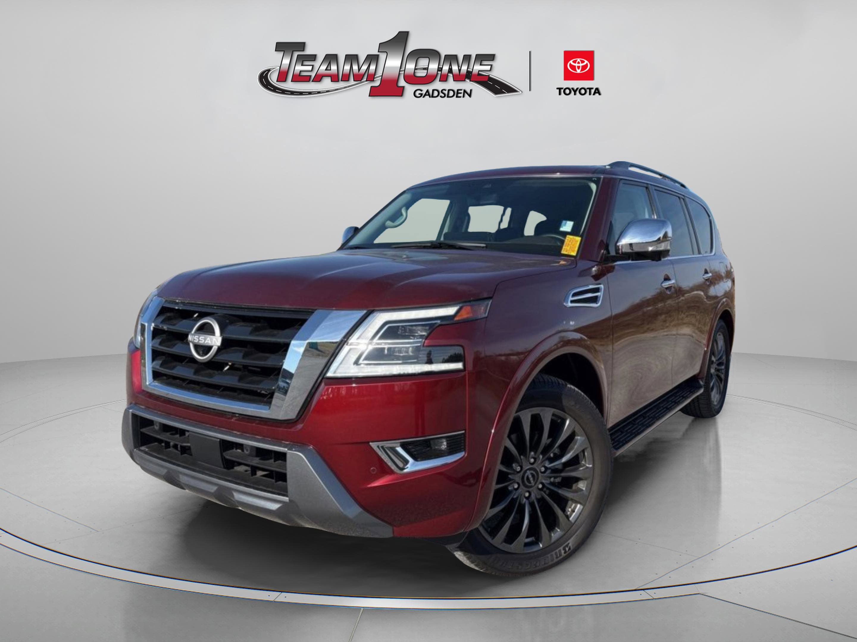 Team One Toyota welcomes drivers and car buyers from Gadsden, Albertville, Boaz, Anniston and Oxford, AL to our full-service Toyota dealership. We proudly serve the local communities from our Rainbow City AL dealership location with not only an extensive selection of the very latest vehicles from Toyota, but also with pre-owned car sales and financing, plus professional auto service. CALL 256-413-4456 or visit teamonetoyota.com. 2024 Nissan Armada Platinum. Contactless Purchase, Free Home Drop-off, Free Test Drive at Home, Private Dealership Appointments, Virtual Appointments, Custom Online Financing. Shop, visit or contact us today at 256-413-4456 for your Toyota auto needs around Gadsden, Anniston and Oxford, AL. Teamonetoyota.com.