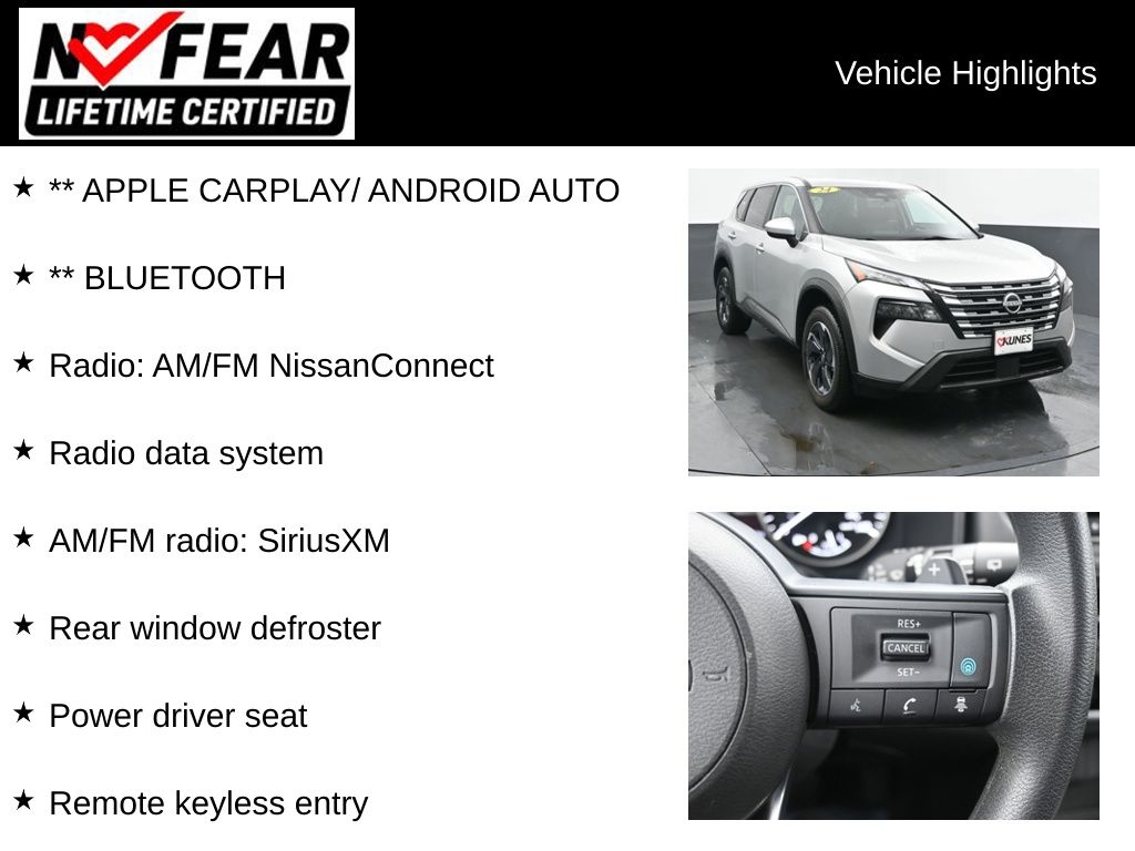 2024 Nissan Rogue SV Brilliant Silver Metallic FWD 1.5L DOHC. Recent Arrival! While we make every effort to ensure the data listed here is correct, there may be instances where some of the factory rebates, incentives, options or vehicle features may be listed incorrectly as we get data from multiple data sources. PLEASE MAKE SURE to confirm the details of this vehicle with the dealer to ensure its accuracy. It does not include any tax, title, license or documentary service fee of $367.70. Consult the dealer for fee, payments and complete details. In transit means that vehicles have been built but have not yet arrived at our dealership; images shown may not necessarily represent exact vehicles in transit to your dealership. See your dealer for complete details. Consumers, please be aware that the above advertised price assumes you are purchasing the vehicle from the Kunes Auto Group dealership where it is listed as being offered for sale. If the vehicle is transferred from one location to another, a transfer fee for this transportation will be added to the purchase transaction. If you would like to purchase such vehicle without paying a transfer fee, you can take delivery of the vehicle at the store it is listed as being sold from and avoid the additional transfer fee. Shipping fees vary depending on location, contact dealer for shipping details and costs.