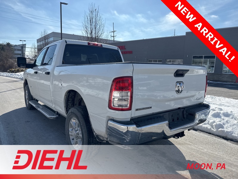 This 2024 Ram 2500 Big Horn Crew Cab is the kind of heavy duty truck that doesn't talk big, it just gets big things done. Finished in Bright White and backed by the legendary 6.7L Cummins turbo diesel, this Ram 2500 Big Horn brings serious muscle to the table with confident four wheel drive and a ride that feels planted whether its towing, hauling, or heading out for a long day on the road. Power comes on smooth and strong through a 6 speed automatic transmission, making highway cruising feel effortless and job site duty feel downright satisfying. Running boards make climbing in easy, while tow hooks, a tow hitch, and a large fuel tank underline that this truck was built with real work in mind, not just looking tough in the parking lot. Inside, the Big Horn cabin balances rugged and comfortable in a way Ram does best. The spacious Crew Cab layout gives everyone room to stretch out, while features like keyless start, power windows and locks, cruise control, and a leather wrapped steering wheel keep daily driving relaxed and intuitive. The touchscreen infotainment system with Apple CarPlay, Android Auto, Bluetooth, and satellite radio keeps you connected, while the backup camera adds confidence when maneuvering something this capable. Safety tech like stability control, traction control, tire pressure monitoring, and a full airbag system help round out a truck that's as smart as it is strong. With its bold presence, diesel torque, and well equipped Big Horn trim, this Ram 2500 is ready to work hard all week and clean up nicely for the weekend. Come see this 2024 Ram 2500 Big Horn Crew Cab for yourself at Diehl of Moon and find out why trucks like this don't stay available for long. When capability meets comfort this well, the decision tends to make itself.