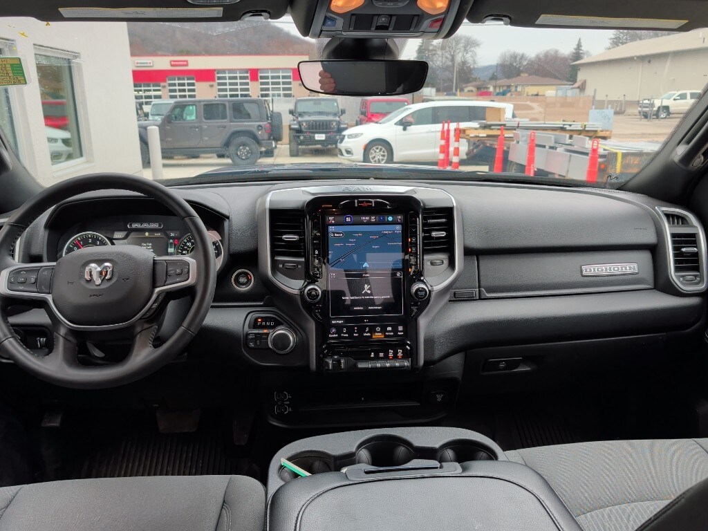 • Level 2 Equipment Group: Rear Window Defroster; Blind Spot and Cross Path Detection; Power Adjustable Pedals; Leather Wrapped Steering Wheel; Rear Power Sliding Window; Rear Dome with On/off Switch Lamp; Front Fog Lamps; Premium Cloth 40/20/40 Bench Seat; Glove Box Lamp; Auto Power-Folding Mirrors; Footwell Courtesy Lamp; Media Hub with 2 Charge Only USBs; Exterior Mirrors with Heating Element; Heated Front Seats; Mirror Running Lights; Heated Steering Wheel; Foam Bottle Insert door Trim Panel; Black Exterior Mirrors; 18 X 8.0 Polished Aluminum Wheels; Dampened Tailgate; Security Alarm; Big Horn Instrument Panel Badge; Power Adjustable Convex Aux Mirrors; Forward and Reverse Utility Lights; Locking Lower Glove Box; Remote Start System; Uconnect 5 Navigation with 12.0 Display Radio; Power Heated Fold Telescope Mirrors; Exterior Mirrors with Supplemental Signals; Steering Wheel Mounted Audio Controls; Exterior Mirrors Courtesy Lamps; Dual Glove Boxes; 115-Volt Auxiliary Front Power Outlet; Cluster 7.0 TFT Color Display; Universal Garage Door Opener; Center Hub; Power Adjust Mirrors; 2nd Row in Floor Storage Bins; Power Telescoping Mirrors; Sun Visors with Illuminated Vanity Mirrors; ParkSense Front/rear Park Assist System