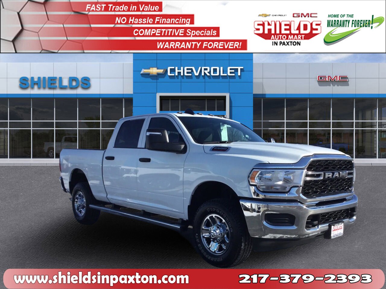 From home to the job site, this White 2024 Ram 2500 Tradesman powers through any situation. The heavy duty Regular Unleaded V-8 6.4 L/392 engine produces freight train-like torque whenever you need it. The road is yours in this vehicle. It's outfitted with the following options: Steel Spare Wheel, Galvanized Steel/Aluminum Panels, Front License Plate Bracket, Deep Tinted Glass, Clearance Lamps, Bright White Clearcoat, Anti-Spin Differential Rear Axle, Wheels with Hub Covers, Variable Intermittent Wipers, and Urethane Gear Shifter Material. Stop by Shields Auto Mart located at 580 John St, Paxton, IL 60957 for a quick visit and a hassle-free deal!
