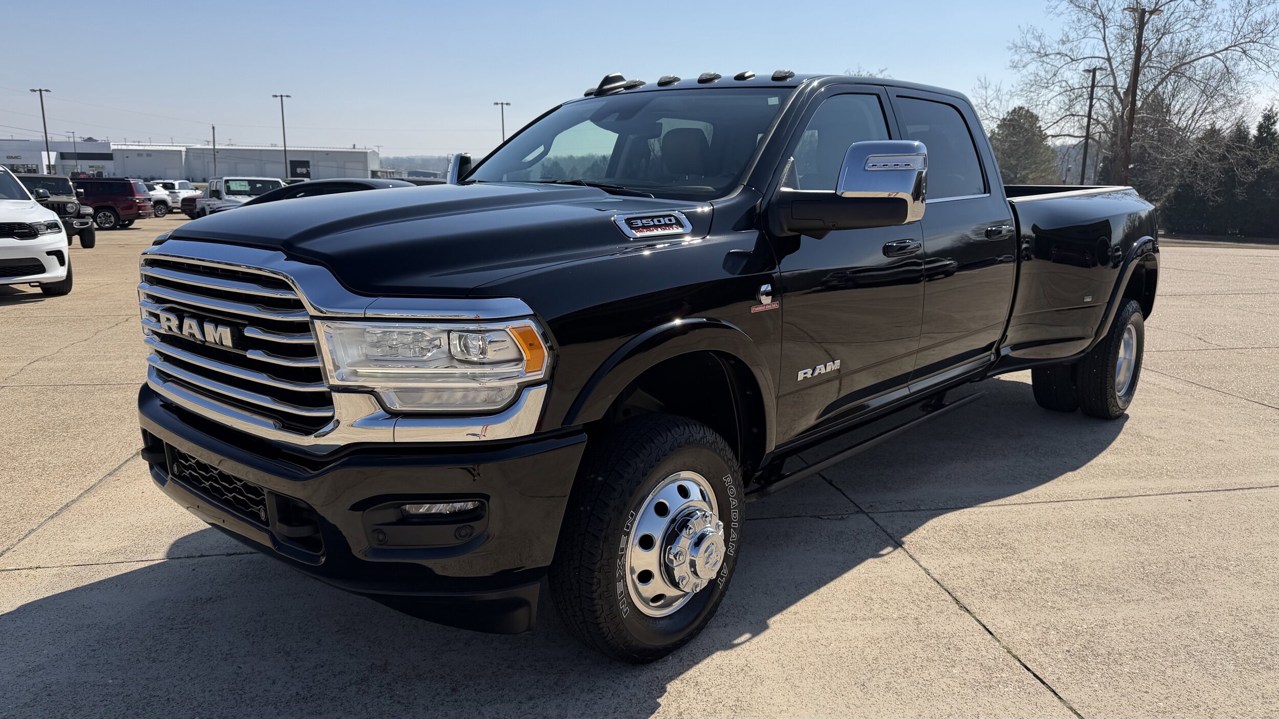 3500 Crew Cab 4x4 Longhorn. This 2024 Ram 3500 Longhorn features a Diamond Black Crystal Pearlcoat exterior and Light Mountain Brown/Mountain Brown interior. Powered by a 6.7L I6 Cummins HO Turbo Diesel engine, it offers impressive towing capabilities and a comfortable, well-appointed cabin for up to five. The truck is equipped with advanced safety and technology features, making it a versatile choice for both work and leisure.