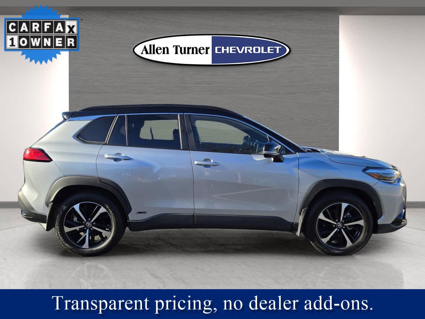Excellent Condition, Carfax 1-Owner. Heated Seats, Moonroof, Aluminum Wheels, Keyless Start, Onboard Communications System, iPod/MP3 Input, Hybrid, All Wheel Drive, Convenience Package. Priced to move. Was $32,988. This Corolla Cross is priced $1,900 below J.D. Power Retail. Cross-Traffic Alert, Lane Keeping Assist, Blind Spot Monitor, Child Safety Locks, Electronic Stability Control, Brake Assist, 4-Wheel ABS, Tire Pressure Monitoring System, 4-Wheel Disc Brakes Toyota Hybrid XSE with Sonic Silver/Jet Black exterior and Black interior features a 4 Cylinder Engine with 196 HP at 6000 RPM. Come see the difference at Allen Turner Chevrolet Cadillac of Auburn. Under new ownership. No dealer add-ons. No pressure. Just honest, upfront transparent pricing on every vehicle-- online and in-store!