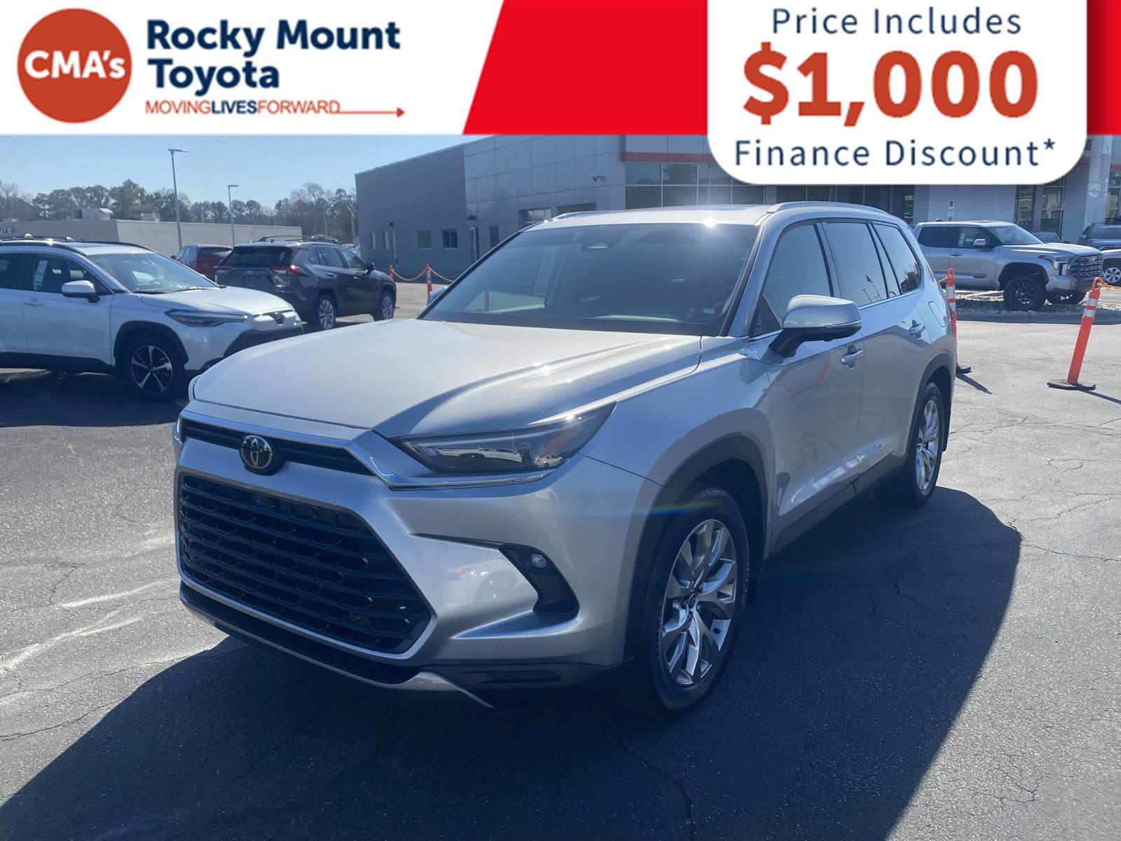 Thank you for choosing CMA's Rocky Mount Toyota, this Celestial Silver Metallic 2024 Toyota Grand Highlander Limited is a great choice! Check out the following: No Accidents! One Owner! City 21/ Hwy 28. At Rocky Mount Toyota we believe in LIVE MARKET PRICING on all vehicles in our inventory. We use real-time market price comparisons to constantly adjust prices to provide all buyers the best value price possible. Our entire team is committed to helping you buy a car the way we would want to buy a car!