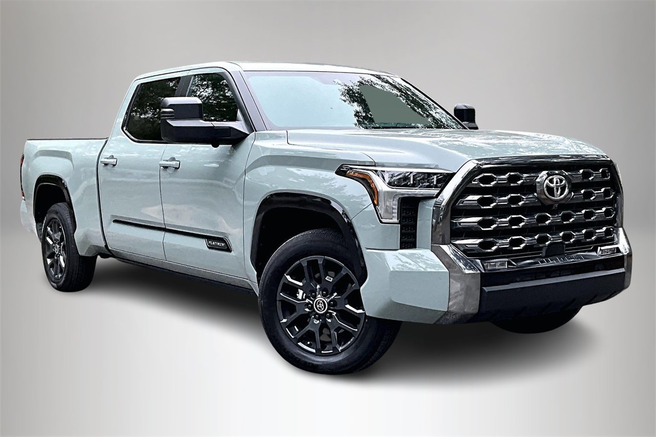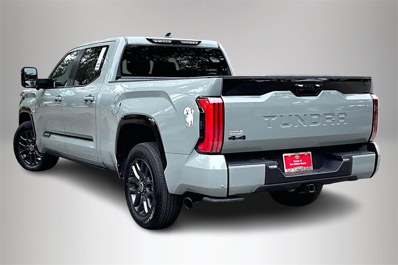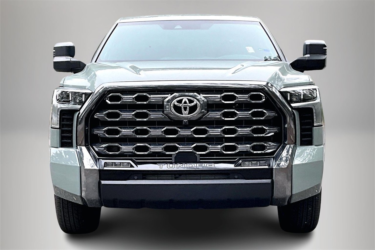 Command the road with confidence in this 2024 Toyota Tundra Platinum, finished in a striking Green exterior and equipped with 4WD for exceptional capability in all driving conditions. Powered by a robust 3.4L V6 engine paired with a smooth 10-speed automatic transmission, this full-size truck delivers an excellent balance of power and efficiency with an EPA-estimated 17 city / 22 highway MPG. This Carfax One-Owner Tundra is a Recent Arrival and boasts an odometer reading 20,261 miles below market average, making it an outstanding value at Toyota of Fort Walton Beach. The Platinum trim elevates refinement with premium styling and upscale details, including 20-inch dark painted alloy wheels, body-color bumpers, rain-sensing wipers, LED lighting, and a power moonroof. Inside, the cabin is trimmed in Black leather seating surfaces and offers exceptional comfort with 10-way power-adjustable heated and ventilated front seats, heated and ventilated rear seats, and a heated steering wheel with memory. Technology is front and center with the Toyota Audio Multimedia System, Apple CarPlay and Android Auto. Safety and options are not included in this description. Driver-focused features such as a HomeLink garage door transmitter, steering wheel-mounted controls, digital displays, and memory seating enhance everyday convenience. Safety and confidence come standard thanks to Toyota Safety Connect with a 10-year trial, a rearview backup camera, electronic stability control, traction control, brake assist, multiple airbags, and advanced driver-assist technologies designed to keep you protected on every journey.