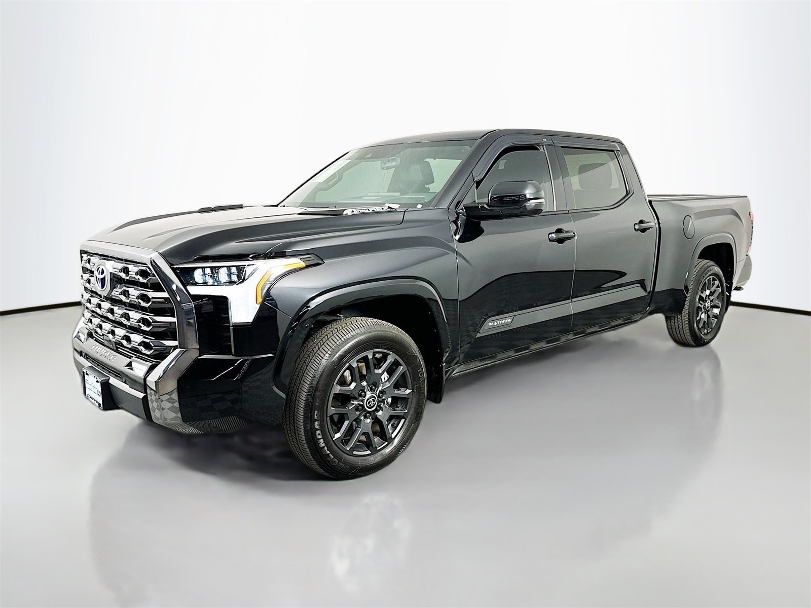 CARFAX One-Owner. Black 2024 Toyota Tundra Hybrid Platinum 4D Crew Cab 3.4L V6 10-Speed Automatic 4WD Android Auto, Apple CarPlay, Panorama Roof, Leather, Keyless Entry, Blind Spot, Back Up Camera, Heated Seats, BlueTooth, 3.4L V6, 12 Speakers, 4-Wheel Disc Brakes, ABS brakes, Air Conditioning, AM/FM radio: SiriusXM, Apple CarPlay/Android Auto, Auto High-beam Headlights, Auto-dimming door mirrors, Auto-dimming Rear-View mirror, Automatic temperature control, Backup Camera, Brake assist, Bumpers: body-color, Delay-off headlights, Driver door bin, Driver vanity mirror, Dual front impact airbags, Dual front side impact airbags, Emergency communication system: Safety Connect (10-year trial), Front anti-roll bar, Front Bucket Seats, Front Center Armrest, Front dual zone A/C, Front fog lights, Front reading lights, Front wheel independent suspension, Fully automatic headlights, Garage door transmitter: HomeLink, Heated & Ventilated Front Bucket Seats, Heated door mirrors, Heated front seats, Heated rear seats, Heated steering wheel, Illuminated entry, Knee airbag, Leather Seat Trim, Leather Shift Knob, Low tire pressure warning, Memory seat, Navigation System, Occupant sensing airbag, Outside temperature display, Overhead airbag, Overhead console, Passenger vanity mirror, Power door mirrors, Power driver seat, Power moonroof, Power passenger seat, Power steering, Power windows, Radio data system, Radio: Premium Audio w/JBL, Rear reading lights, Rear seat center armrest, Rear step bumper, Rear window defroster, Remote keyless entry, Speed-sensing steering, Split folding rear seat, Steering wheel memory, Steering wheel mounted audio controls, Tachometer, Telescoping steering wheel, Tilt steering wheel, Traction control, Trip computer, Turn signal indicator mirrors, Ventilated front seats, Ventilated rear seats, Voltmeter.