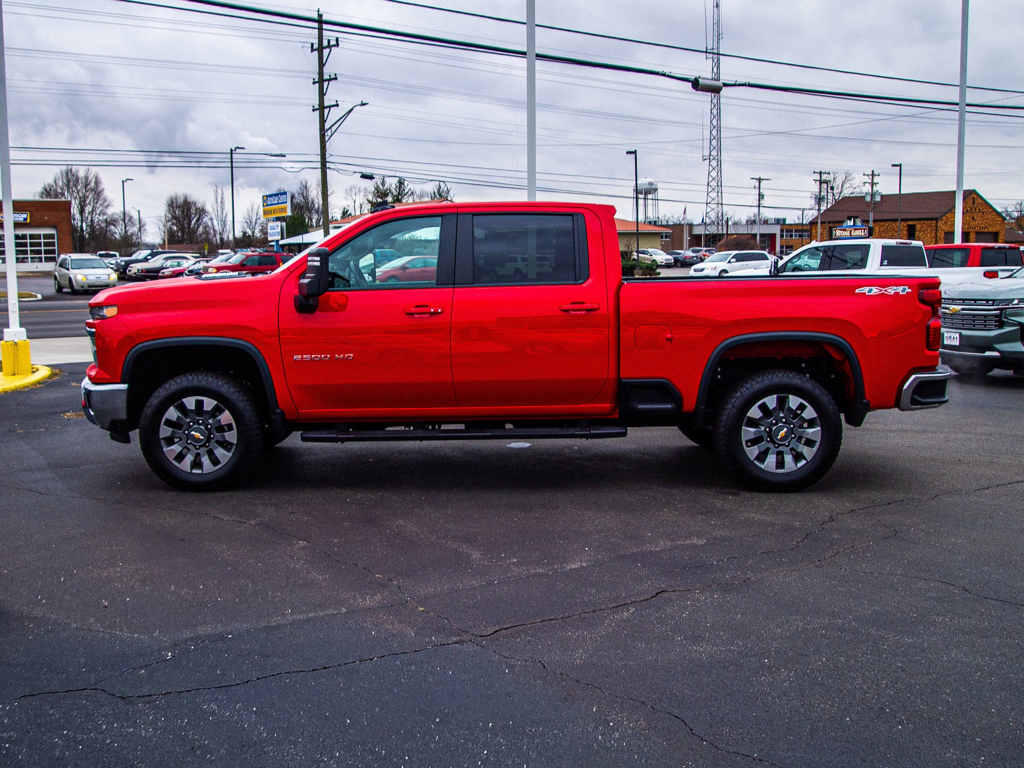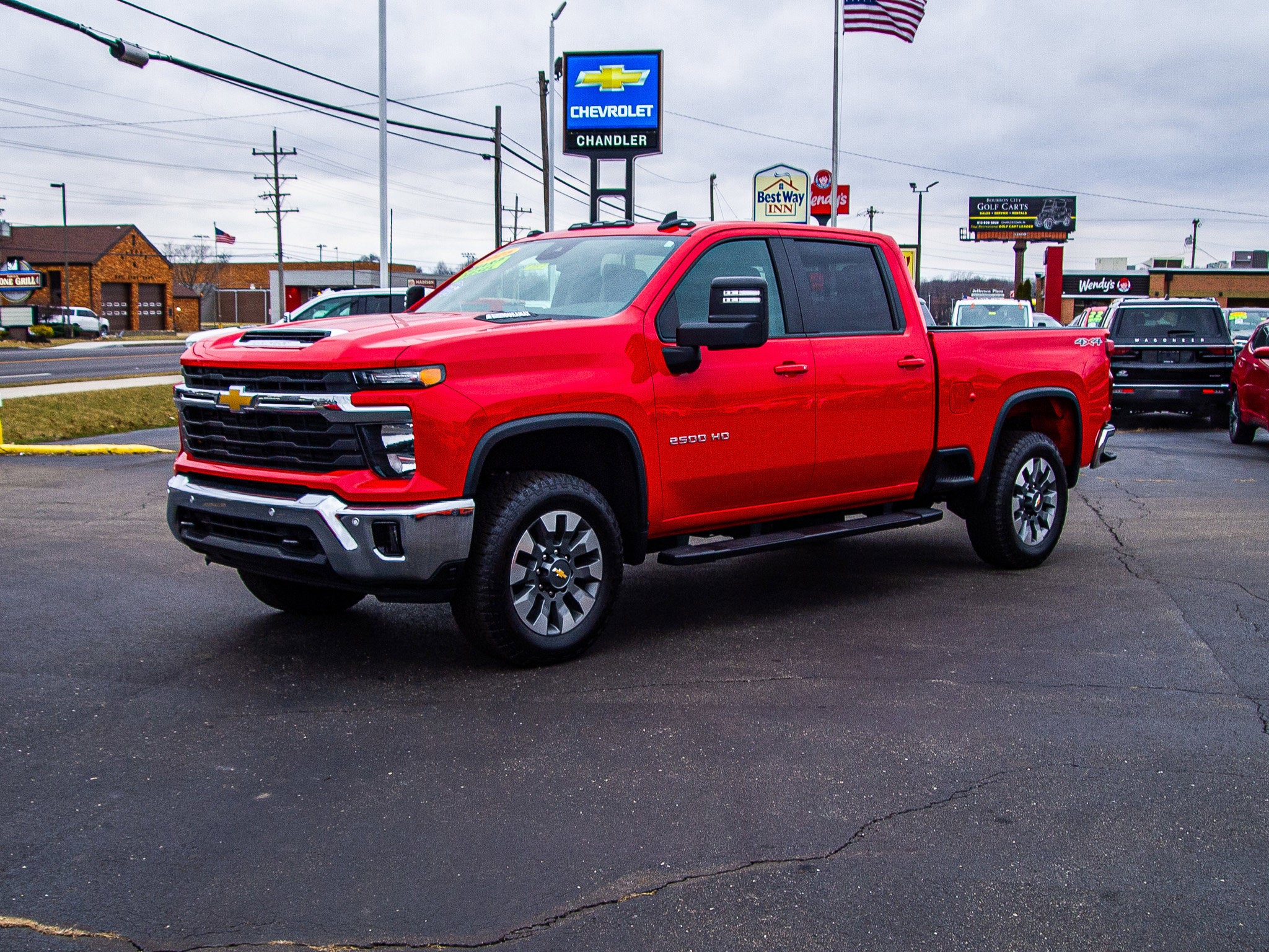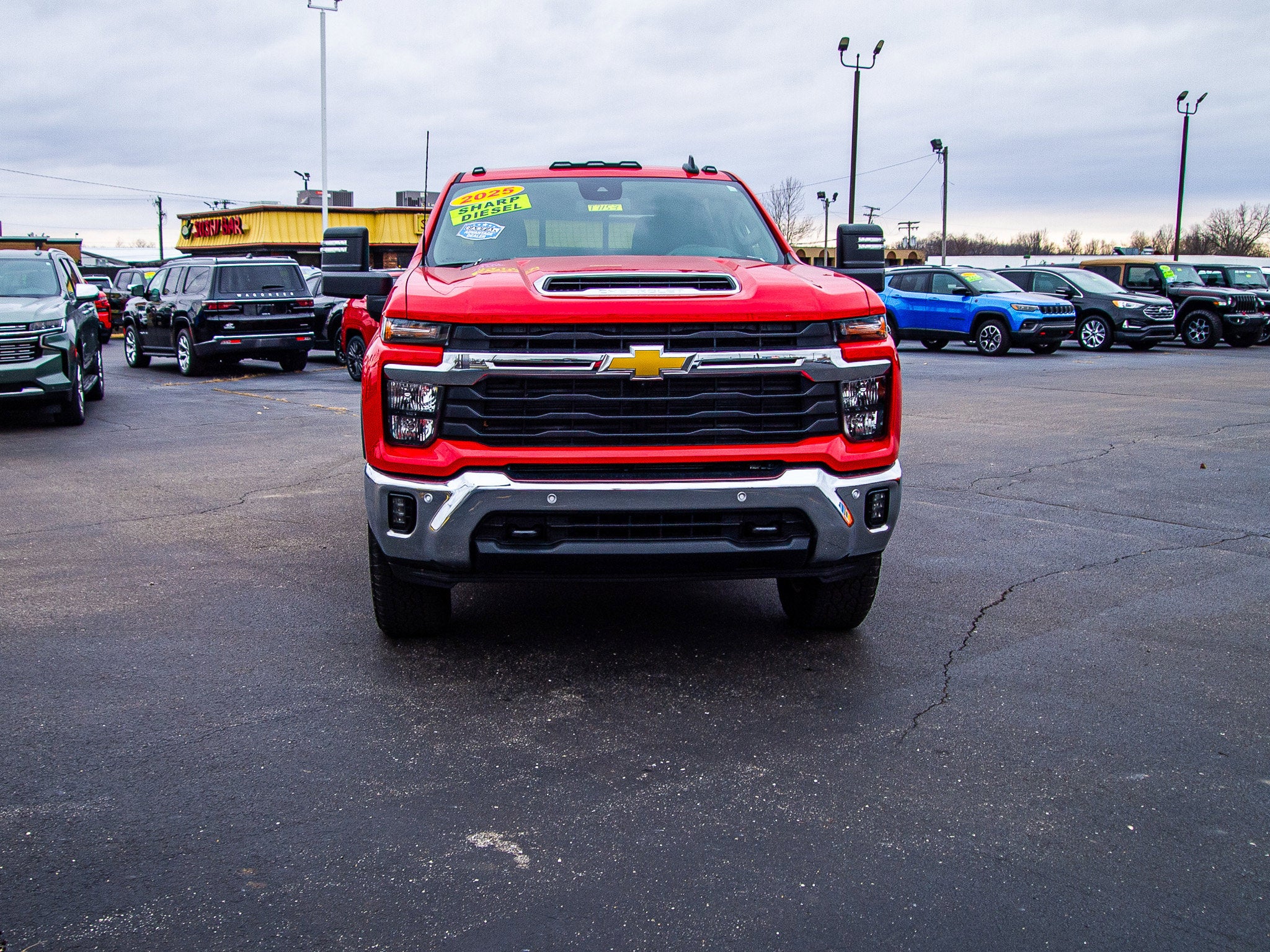 The 2025 Chevrolet Silverado 2500 HD LT is a used crew cab truck with a 6.6L Duramax Turbo-Diesel V8 engine and Four Wheel Drive. It features a Red Hot exterior and Jet Black interior. The vehicle is equipped with a variety of comfort and safety features, and its condition is listed as used with 14,175 miles.