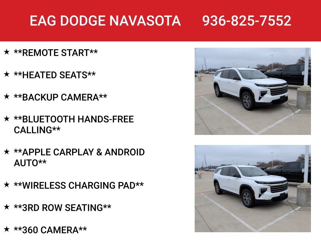 Recent Arrival! Summit White 2025 Chevrolet Traverse LT 1LT FWD 8-Speed Automatic 2.5L DOHC 20/27 City/Highway MPG. This vehicle is located at EAG CDJR Navasota but can be made available upon request. The price listed does not include tax, title, license, or documentation fees ($225).