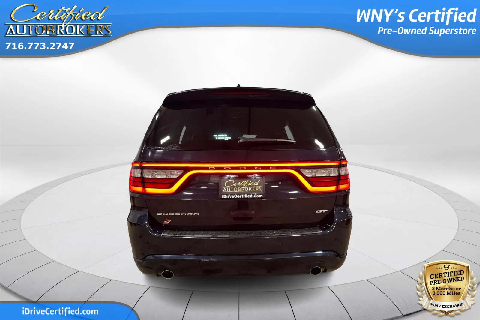 This 2025 Dodge Durango GT AWD has 28,000 miles and delivers strong V6 performance with confident all-season capability. Powered by a 3.6L Pentastar V6 engine paired with an 8-speed automatic transmission, it provides smooth acceleration, responsive passing power, and composed highway cruising. The all-wheel-drive system enhances traction and stability in snow, rain, and changing road conditions, making it well suited for Western New York driving year-round. Finished in Night Moves Blue with a Black interior, this GT trim offers a sporty and functional 3-row cabin with seating for up to seven passengers. Features include heated front seats, a heated steering wheel, 8-way power driver seat with lumbar support, 3-zone automatic climate control, remote start, push-button start, and a power liftgate. Red accent stitching and paddle shifters add a performance-inspired touch to the interior design. This vehicle runs on gasoline and delivers an EPA-estimated 17 MPG city and 24 MPG highway, achieving 20 MPG combined, offering a balanced mix of performance and efficiency for a midsize AWD SUV. This 2025 Dodge Durango GT AWD has undergone thorough inspections to meet the high standards set by Certified AutoBrokers and comes with a 3-month or 3,000-mile warranty along with our exclusive 3-day or 300-mile exchange policy.