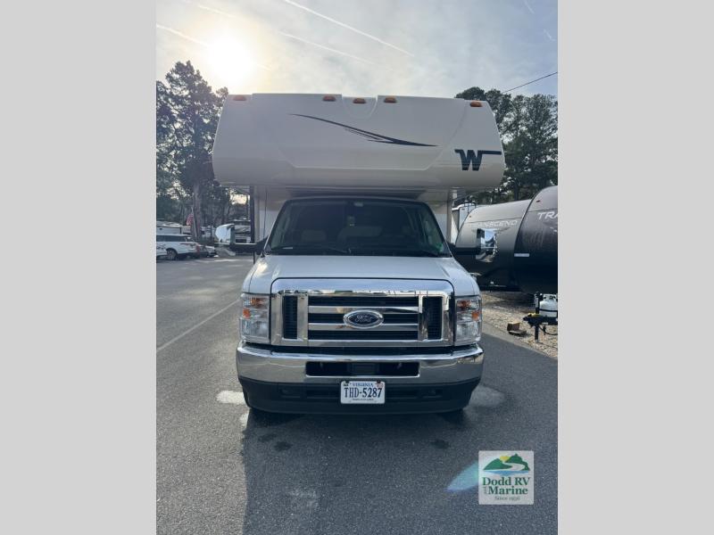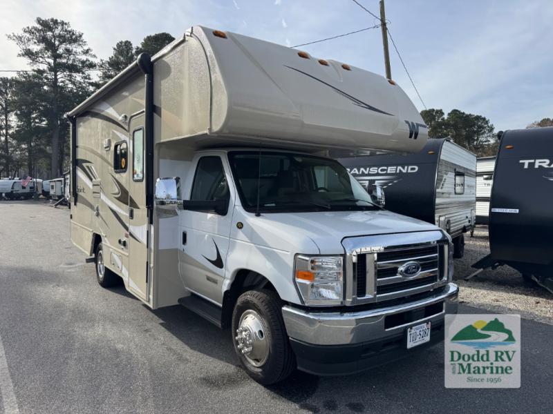 Winnebago Spirit Class C gas motorhome 22M highlights: RV Queen Bed Slide Out, Cabover Bunk, Pantry, Stainless Steel Sink, 14' Power Awning with LED Lights. Your crew of five will love traveling and camping in this cozy coach. Once you arrive at the campground, the cook can prepare lunch on the three burner cooktop, or use the microwave oven if you're wanting something quick. If you need to freshen up from driving all day, there is a 23" x 34" shower in the full bath, plus a shower skylight and a medicine cabinet where you'll find your necessities. This model includes a U-shaped dinette that will be perfect for meal times, a game of Monopoly, and additional sleeping space, or you may just find yourselves outdoors under the 14' power awning with LED lights. And don't overlook the storage space in this model with a bedroom wardrobe, a kitchen pantry, plus a large lighted trunk storage for larger camp gear! Each Spirit Class C gas motorhome by Winnebago features a powerful 7.3L V8 premium engine with a durable Ford E450 chassis. The exterior is eye-catching with its premium high-gloss fiberglass skin, along with the molded front cap, and your choice of four exterior color options. Your journey will be made enjoyable by the multi-adjustable slide/recline cab seats, and the radio/rearview monitor system includes an 8.95" multi-function touchscreen with a rear color camera for easy maneuvering in and out of campgrounds. Each model includes Corian solid surface countertops, vinyl flooring throughout, black-out roller shades, plus many more comforts you won't want to camp without!