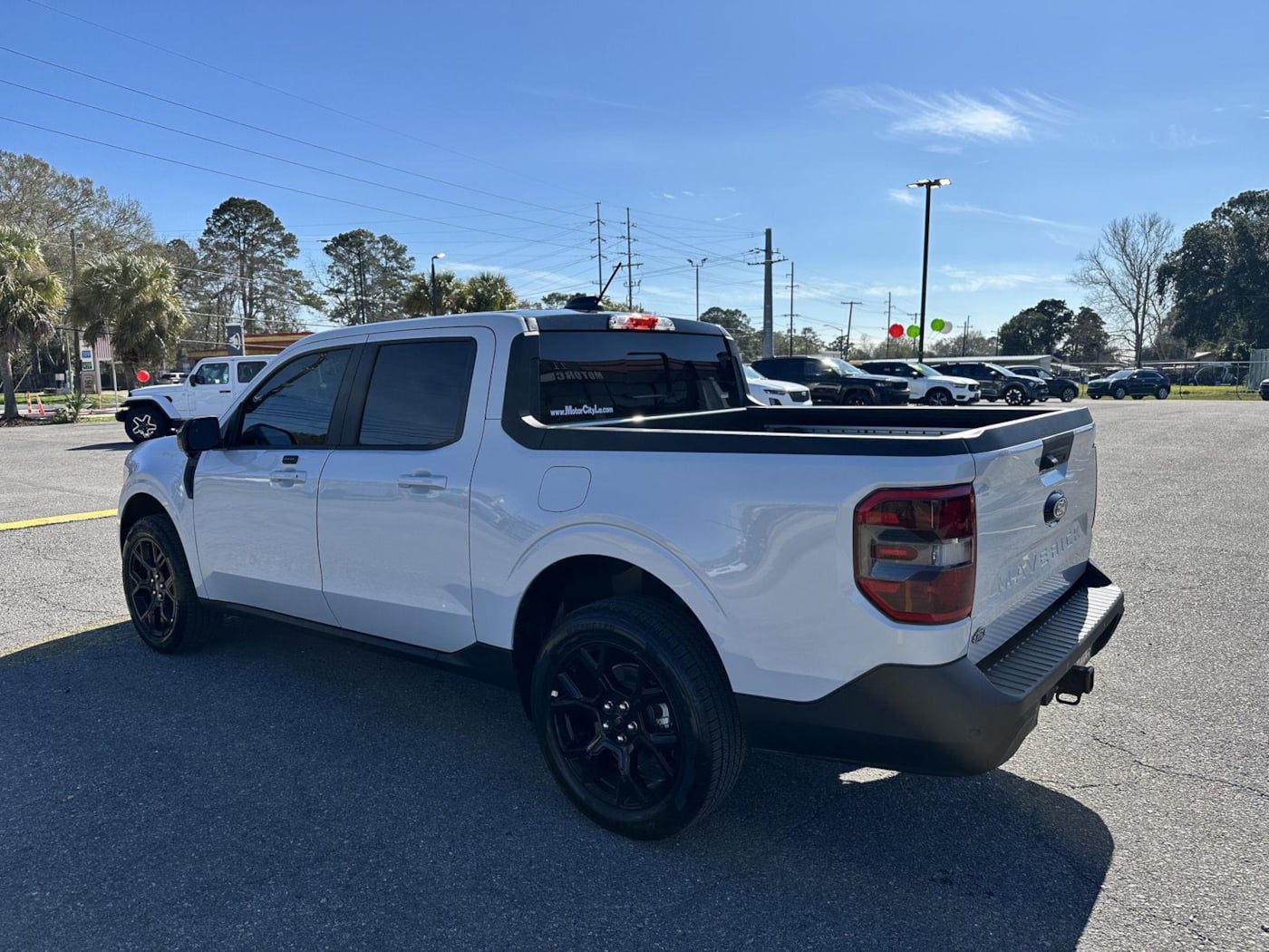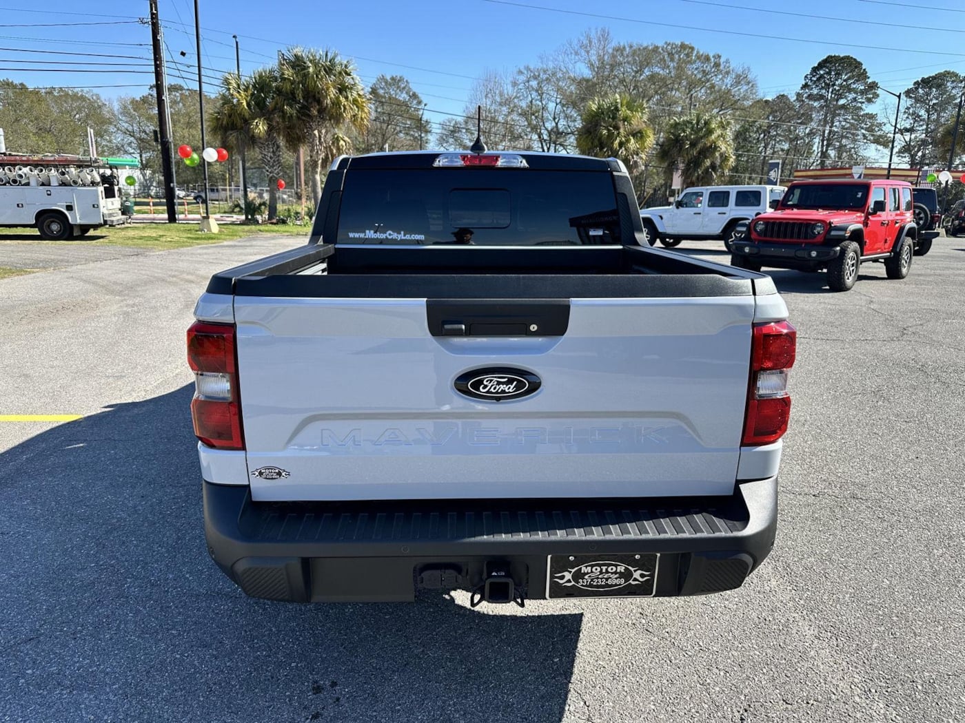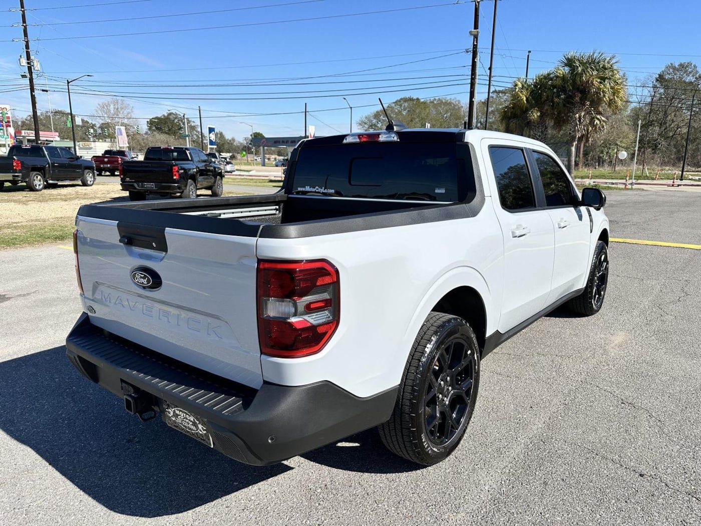 This 2025 Ford Maverick Lariat, has a Space White Metallic exterior and a Black Onyx interior color. 7,509 miles. Stock Number 13032. You can connect with us by calling 337-232-6969. No Accidents! One Owner! Engine: 2.0L EcoBoost, 4K Tow Package, Black Appearance Package. Black Interior Accents. Front and Back Black Edition Ford Logo. Black Grille. 19" Black Painted Aluminum Wheels. Equipment Group 502A. 8-Speed Automatic Transmission. ActiveX Trimmed Heated Front Bucket Seats. 2.0L EcoBoost Engine. B&O Sound System by Bang and Olufsen. 19" Tires. Trailer Brake Controller. Upgraded Cooling Fan. Trailer Hitch (class III) 2" Receiver. Transmission Oil Cooler. Higher Capacity Radiator. Conventional 17" Spare Tire (215/70R17).