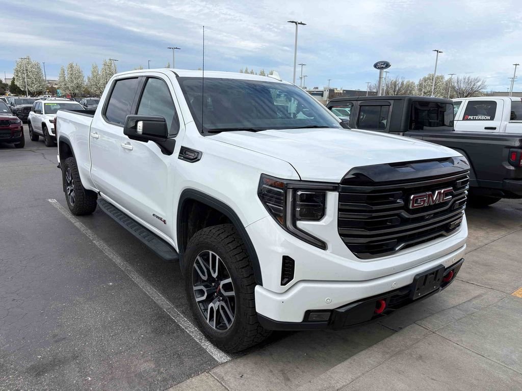 A diesel-driven trail machine, our One Owner, No Accidents Reported 2025 GMC Sierra 1500 AT4 Crew Cab Short Bed 4X4 with the Premium Pack powers through extreme challenges in Summit White! Motivated by a TurboCharged 3.0 Liter DuraMax Diesel 6 Cylinder serving up 305hp and 495lb-ft of torque to a 10 Speed Automatic transmission. A 2-inch lift, a 2-speed transfer case, and an auto-locking rear differential help dominate difficult terrain, and this Four Wheel Drive truck scores nearly 19mpg on the highway. Our Sierra also features off-road styling, complete with LED lighting, red recovery hooks, a spray-on bedliner, a MultiPro tailgate, robust skid plates, perimeter lighting, alloy wheels, a power sunroof, and the Premium Pack's high-clearance side steps. Our AT4 cabin is engineered for comfortable adventures and features heated/ventilated leather power front seats, heated rear seats, a heated-wrapped power steering wheel, dual-zone automatic climate control, and our Premium Pack, which includes a power rear window with defogger. Modern technologies for mobile connections start with a 13.4-inch touchscreen, a 12.3-inch driver display, Google Built-In, wireless charging, WiFi compatibility, wireless Android Auto/Apple CarPlay, Bluetooth, and Bose audio. Drive confidently, knowing GMC's smart safety systems include adaptive cruise control, front/rear automatic braking, HD surround vision, hill descent control, trailer blind-spot monitoring and more. Crafted to exceed expectations.
