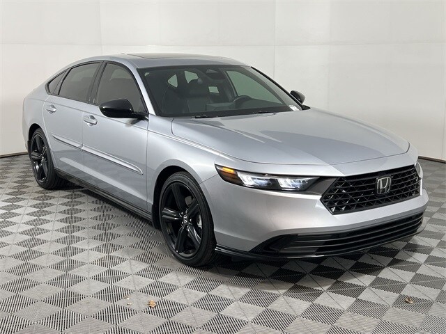 Silver Metallic 2025 Honda Accord Hybrid Sport-L FWD eCVT 2.0L I4 DOHC 16V 2.0L I4 DOHC 16V, 1 owner no accident Carfax, reduced down from JD Power Retail 34950. Jim Ellis Mazda Marietta is pleased to offer this good-looking 2025 Honda Accord Hybrid Sport-L in Silver Metallic, beautifully equipped with 2.0L I4 DOHC 16V, 4-wheel disc brakes, 8 speakers, ABS brakes, Adaptive Cruise Control: Adaptive Cruise Control (ACC) with Low-Speed Follow, air conditioning, alloy wheels, AM/FM radio, Apple CarPlay/Android Auto, auto high-beam headlights, automatic temperature control, blind spot information system warning, brake assist, bumpers: body-color, compass, delay-off headlights, driver door bin, driver vanity mirror, dual front impact airbags, dual front side impact airbags, electronic stability control, emergency communication system: HondaLink, exterior parking camera rear, four wheel independent suspension, front anti-roll bar, front bucket seats, front center armrest, front dual zone A/C, front reading lights, fully automatic headlights, heated front bucket seats, heated front seats, illuminated entry, knee airbag, lane departure: Lane Keeping Assist System (LKAS) active, leather shift knob, leather steering wheel, leather-trimmed seat trim, low tire pressure warning, memory seat, occupant sensing airbag, outside temperature display, overhead airbag, overhead console, panic alarm, passenger door bin, passenger vanity mirror, power door mirrors, power driver seat, power moonroof, power passenger seat, power steering, power windows, radio data system, radio: 180-Watt Audio System, rear anti-roll bar, rear reading lights, rear seat center armrest, rear side impact airbag, rear window defroster, remote keyless entry, security system, speed control, speed-sensing steering, speed-sensitive wipers, split folding rear seat, spoiler, steering wheel mounted audio controls, telescoping steering wheel, tilt steering wheel, traction control, trip computer, variably intermittent wipers. Odometer is 2283 miles below market average! 46/41 City/Highway MPG. At Jim Ellis Mazda we’re proud to serve drivers across Marietta Atlanta Kennesaw Canton Sandy Springs and Alpharetta and throughout Cobb Fulton DeKalb Douglas and Gwinnett counties. Whether you’re here for trusted Mazda service genuine parts or an exceptional new or pre-owned vehicle you can count on our family-owned dealership to deliver the care quality and value you deserve. Discover the Jim Ellis difference today where your satisfaction always comes first.