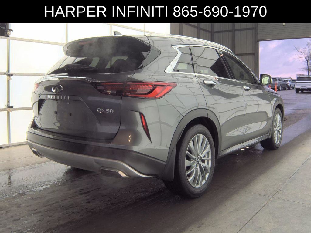 Elevate your driving experience with this stunning 2025 INFINITI QX50 LUXE. This exceptional SUV is a true testament to INFINITI's commitment to craftsmanship and performance. Boasting a sleek and sophisticated Gray exterior, this QX50 LUXE is a head-turner on the road. Beneath the surface, it's powered by a robust I4 engine paired with a smooth-shifting CVT and AWD system, delivering a dynamic and confident driving experience. The QX50 LUXE's interior is a sanctuary of refinement, with Leather-Appointed Seat Trim, Heated Front Bucket Seats, and a Power Passenger Seat. The intuitive technology, including the INFINITI InTouch system, keeps you connected and in control. Safety is paramount, and this QX50 LUXE is equipped with a suite of advanced driver-assistance features, including Rear Parking Sensors, Exterior Parking Camera Rear, and Auto High-beam Headlights. You can navigate the roads with confidence, knowing you and your loved ones are well-protected. With an impressive EPA-estimated 22 MPG in the city and 28 MPG on the highway, this QX50 LUXE delivers exceptional efficiency, making it an ideal choice for your daily commute and weekend adventures. Discover the perfect balance of style, performance, and technology in this 2025 INFINITI QX50 LUXE. Experience the difference that INFINITI's commitment to excellence can make in your driving experience. Harper Infiniti is excited to offer this stunning 2025 INFINITI QX50 LUXE in Gray. Harper Infiniti believes in the quality of the vehicles we sell so well that we provide an unlimited miles, powertrain warranty on every new and qualifying pre-owned vehicle it sells! This warranty is good at any ASE certified shop in the 48 continental United States! Check out all these great options Bose 12-Speaker Premium Audio, Illuminated Kick Plates, and Splash Guards (Set of 4).