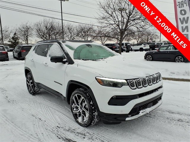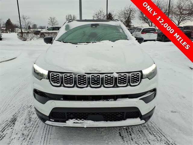 REMAINDER OF FACTORY WARRANTY, FULLY SERVICED, LOCAL TRADE, 4WD, 10.1" Touchscreen Display, 2nd Row USB Type A/C Charge Only, 360 Surround View Camera System, Active Driving Assist System, Alexa Built-In, Cluster 10.25" TFT Color Display, Connected Travel & Traffic Services, Diamond Black Door Cladding, Diamond Black Exterior Sill, Diamond Black Fascias, Diamond Black Wheel Flares, Driver Assist Group I, Driver Seat Memory, Elite Group, Foot Activated Open 'N Go Liftgate, GPS Navigation, HD Radio, Integrated Voice Command w/Bluetooth, LED Low/Highbeam Projector Headlamps, Power 2-Way Passenger Lumbar Adjust, Power 8-Way Adjust Front Passenger Seat, Power Liftgate, Premium Leather Trimmed Bucket Seats, Premium LED Fog Lamps, Premium Taillamps, Reversible Carpet/Vinyl Cargo Mat, SiriusXM w/360L, Traffic Sign Recognition, Ventilated Front Seats, Wheels: 19" x 7.5" Painted Diamond Cut Aluminum, Wireless Charging Pad. CARFAX One-Owner. Clean CARFAX. Bright White Clearcoat 2025 Jeep Compass Limited certified 12,000 miles 4D Sport Utility 4WD 8-Speed Automatic 2.0L I4 DOHC. Recent Arrival! 24/32 City/Highway MPG.