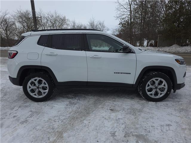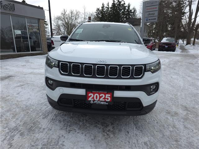 2025 Jeep Compass North 4x4. Bright White, Black interior / Black seats, Premium cloth/vinyl bucket seats, 2.0L DOHC I–4 DI turbocharged engine with Stop/Start, 8-speed automatic, Selec–Terrain Traction Management System, Jeep Clean Air System, Forward Collision Warning.