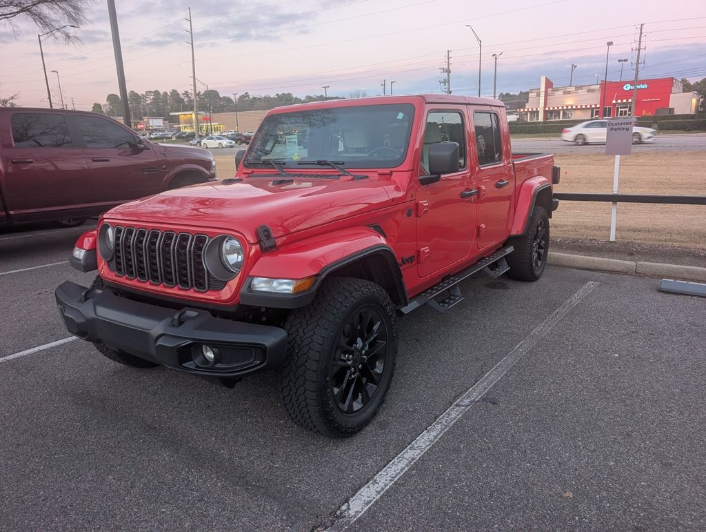 This 2025 Jeep Gladiator Nighthawk in Firecracker Red Clearcoat comes with the following features: 3.6L V6 24V VVT 8-Speed Automatic 4WD, Bluetooth Hands-Free Calling, Keyless Entry, and Rear View Back-Up Camera. Quick Order Package 24X Night Hawk (DISC) includes Anti-Spin Differential Rear Axle, Body Color Fender Flares (2-Piece), Dana M210 Wide Front Axle, Dana M220 Wide Rear Axle, Daytime Running Lamp System, Deep Tint Sunscreen Windows, Mold In Color Bumper w/Gloss Black, Power Heated Mirrors, Protection Sill Rails, Sport Rear Shock Absorbers, Sport Suspension (DISC), and Wheels: 20" x 8" Painted Black Aluminum (DISC). The vehicle is equipped with a 12.3" Touchscreen Display, 3.73 Rear Axle Ratio, 4-Wheel Disc Brakes, 4G LTE Wi-Fi Hot Spot, 8 Speakers, ABS brakes, Air Conditioning, Alexa Built-In, AM/FM radio: SiriusXM, Apple CarPlay, Apple CarPlay/Android Auto, Body Color 3-Piece Hard Top, Brake assist, Cloth Low-Back Bucket Seats, Compass, Connectivity - US/Canada, Dana M210 Wide Front Axle, Dana M220 Wide Rear Axle, Daytime Running Lamp System, Deep Tint Sunscreen Windows, Delay-off headlights, Driver door bin, Driver vanity mirror, Dual front impact airbags, Dual front side impact airbags, Electronic Stability Control, Freedom Panel Storage Bag, Front anti-roll bar, Front Bucket Seats, Front Center Armrest w/Storage, Front fog lights, Front reading lights, Google Android Auto, Illuminated entry, Integrated roll-over protection, Low tire pressure warning, Normal Duty Suspension, Occupant sensing airbag, Outside temperature display, Overhead airbag, Panic alarm, ParkView Rear Back-Up Camera, Passenger door bin, Passenger vanity mirror, Power Heated Mirrors, Power steering, Power windows, Protection Sill Rails, Quick Order Package 24X Night Hawk (DISC), Radio data system, Radio: Uconnect 5 w/12.3" Display, Rear anti-roll bar, Rear reading lights, Rear Sliding Window, Rear Window Defroster, Remote keyless entry, Speed control, Split folding rear seat, Sport Rear Shock Absorbers, Sport Suspension (DISC), Steering wheel mounted audio controls, Tachometer, Telescoping steering wheel, Tilt steering wheel, Traction control, Trip computer, USB Host Flip.