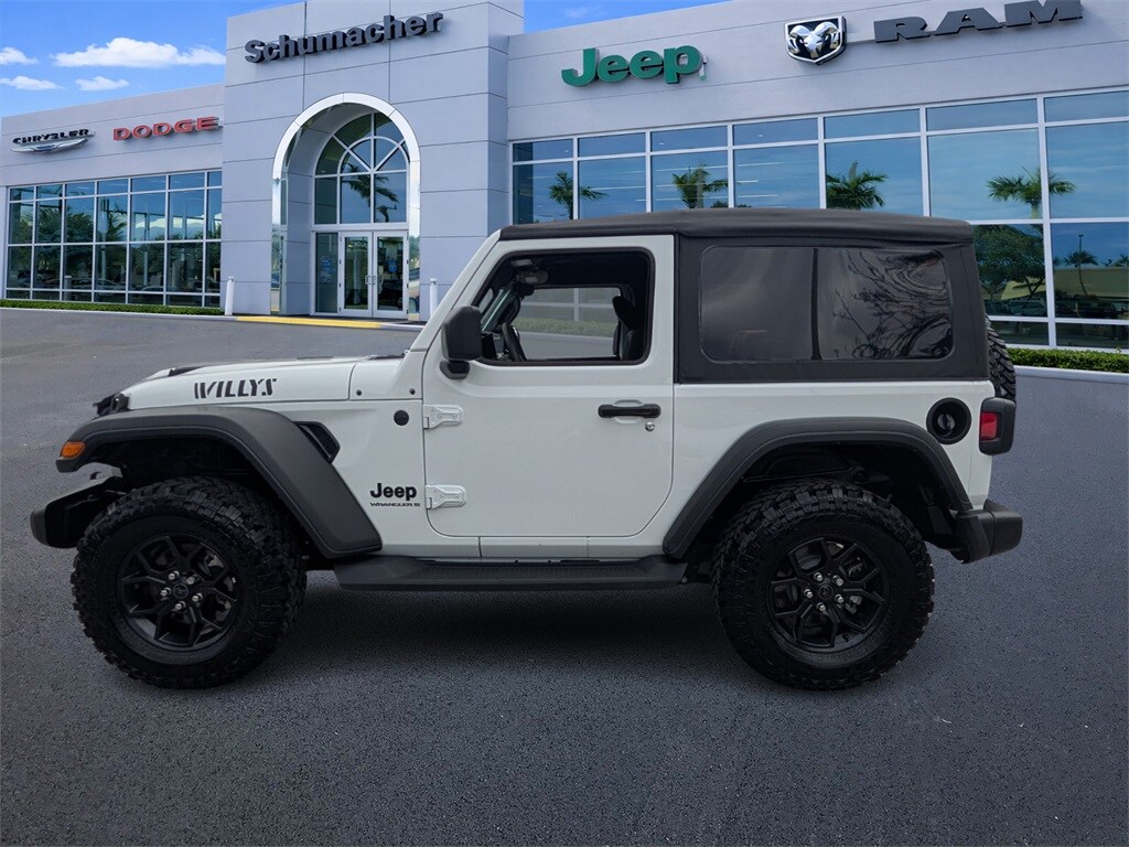 Welcome to Schumacher Automotive Delray, where buying a pre-owned vehicle is more than a transaction, it's joining our family. As a proud, family-owned business located at 2102 South Federal Highway in Delray Beach, Florida, our mission is built entirely around your satisfaction and helping you find the perfect vehicle to fit your life and budget. We understand the importance of trust and transparency in every purchase, and that's why we invite you to experience the Schumacher difference for yourself. Come join the family! Recent Arrival! Odometer is 1301 miles below market average! 2025 Jeep Wrangler Willys Bright White Clearcoat 2.0L I4 DOHC 4WD FCA US LLC Certified Pre-Owned Details: Limited Warranty: 3 Month/3,000 Mile (whichever comes first) after new car warranty expires or from certified purchase date Vehicle History Roadside Assistance Warranty Deductible: $100 Transferable Warranty 125 Point Inspection Vehicles Up to 75,000 Miles and/or 5 Model Years. 24-Hour Towing & Roadside Assistance, Car Rental Allowance, CARFAX Vehicle History Report and an Introductory 3-month Subscription to SiriusXM Satellite Radio & Certified Warranty Upgrades Powertrain Limited Warranty: 84 Month/100,000 Mile (whichever comes first) from original in-service date Clean CARFAX. CARFAX One-Owner. Act fast—our aggressively priced, high-quality pre-owned vehicles at Schumacher Automotive Delray simply do not last; visit us today at 2102 South Federal Highway, Delray Beach, Florida 33483, or contact us right away to secure yours before it's gone!