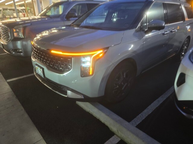 Ceramic Silver 2025 Kia Carnival Hybrid SX FWD 6-Speed Automatic 1.6L I4 DGI Hybrid Turbocharged DOHC 16V LEV3-SULEV30, 3rd row seats: split-bench, 4-Wheel Disc Brakes, 8 Speakers, ABS brakes, Air Conditioning, Alloy wheels, AM/FM radio: SiriusXM, Apple CarPlay & Android Auto, Artificial Leather Seat Trim, Auto High-beam Headlights, Automatic temperature control, Brake assist, Bumpers: body-color, Cargo Net, Cargo Tray, Carpeted Floor Mats (8-Passenger), Compass, Delay-off headlights, Driver door bin, Driver vanity mirror, Dual front impact airbags, Dual front side impact airbags, Electronic Stability Control, Emergency communication system, Exterior Parking Camera Rear, Four wheel independent suspension, Front anti-roll bar, Front Bucket Seats, Front Center Armrest, Front dual zone A/C, Front fog lights, Front reading lights, Fully automatic headlights, Heated & Ventilated Front Bucket Seats, Heated door mirrors, Heated front seats, Illuminated entry, Knee airbag, Leather Shift Knob, Leather steering wheel, Low tire pressure warning, Memory seat, Navigation system: AVN 5.0 Navigation System, Occupant sensing airbag, Outside temperature display, Overhead airbag, Overhead console, Panic alarm, Passenger door bin, Passenger vanity mirror, Power 2nd-Row Moonroof, Power door mirrors, Power driver seat, Power Liftgate, Power moonroof, Power passenger seat, Power steering, Power windows, Radio: AVN 5.0 Navigation System w/SiriusXM, Rain sensing wipers, Rear air conditioning, Rear anti-roll bar, Rear reading lights, Rear window defroster, Rear window wiper, Reclining 3rd row seat, Remote keyless entry, Security system, Speed control, Speed-sensing steering, Split folding rear seat, Spoiler, Steering wheel mounted audio controls, Tachometer, Telescoping steering wheel, Tilt steering wheel, Traction control, Trailer Prewire Harness, Trip computer, Turn signal indicator mirrors, Variably intermittent wipers, Ventila.