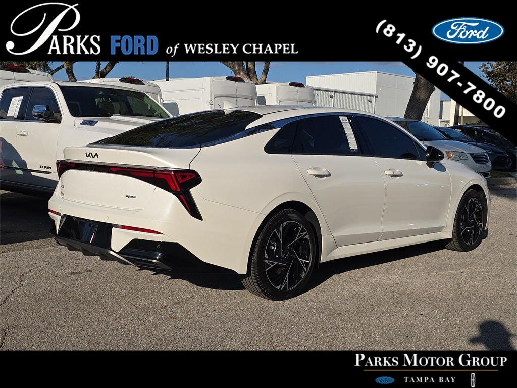 Striking sport-sedan styling, modern driver technology, and near-new condition define this 2025 Kia K5 GT-Line FWD, a midsize sedan engineered to deliver confident performance with everyday comfort and efficiency. With just 6,093 miles and backed by Ford’s Blue Certified program, this K5 provides added peace of mind through a comprehensive 139-point inspection, a 90-day/4,000-mile Comprehensive Limited Warranty, 24/7 Roadside Assistance, and fresh maintenance at delivery. Finished in Snow White Pearl with a Black interior, it presents a sharp, athletic appearance that fits seamlessly into daily driving across Wesley Chapel, Tampa, Brandon, Clearwater, and St. Petersburg. Power comes from Kia’s responsive 2.5L GDI 4-cylinder engine paired with a smooth-shifting 8-speed automatic transmission. This powertrain delivers strong everyday acceleration, refined highway cruising, and excellent fuel efficiency, making it well suited for commuting, errands, and longer Florida road trips. Front-wheel drive provides predictable handling and a comfortable, composed ride, while the multi-link rear suspension enhances stability and cornering confidence. The GT-Line trim adds a sport-inspired edge with distinctive styling and upgraded features throughout. Inside the cabin, you’ll find SynTex-trimmed sport seats, heated front bucket seats, an 8-way power-adjustable driver seat with lumbar support, a heated leather-wrapped steering wheel, dual-zone automatic climate control, and a clean, driver-focused layout. The 60/40 split-folding rear seat allows the interior to easily adapt between passengers and cargo as needed. Technology is a major highlight. The large 12.3-inch touchscreen infotainment system supports wireless Apple CarPlay and Android Auto, Bluetooth connectivity, voice recognition, navigation capability, HD Radio, and SiriusXM compatibility. A digital driver information display keeps essential data easily visible, while steering-wheel-mounted controls allow safe, intuitive operation on the move. Safety and driver-assist features are extensive and confidence-inspiring. This K5 GT-Line includes Highway Driving Assist, Smart Cruise Control with Stop-and-Go, Forward Collision-Avoidance Assist with pedestrian and cyclist detection, Blind-Spot Collision-Avoidance Assist, Rear Cross-Traffic Collision-Avoidance Assist, Lane Keeping Assist, Lane Following Assist, Driver Attention Warning, front and rear parking sensors, a rearview camera with parking guidance, and advanced airbag coverage for both rows. Exterior details reinforce the K5’s sporty character. Features include LED headlamps with automatic high beams, LED brakelights, front fog lamps, gloss-black exterior accents, perimeter approach lighting, and distinctive 18-inch gloss-black machined-finish alloy wheels. The fastback-inspired roofline and sculpted body lines give the K5 a sleek, upscale presence that stands out without being overdone. Ride quality is smooth, quiet, and composed. The suspension absorbs road imperfections well while maintaining responsive steering and confident road feel. The cabin remains refined at highway speeds, making this K5 comfortable for both short commutes and extended drives. This vehicle is backed by the Parks Plus Program, which includes on-demand roadside assistance, adding an extra layer of reassurance during ownership. For drivers in Wesley Chapel, Tampa, Brandon, Clearwater, and St. Petersburg seeking a low-mileage, Blue Certified midsize sedan with modern technology, advanced safety features, and bold sport styling, this 2025 Kia K5 GT-Line FWD represents an exceptional opportunity.