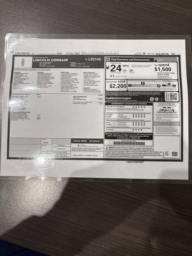 2025 Lincoln Corsair Premiere Recent Arrival! We want you to shop confidently for your next used car at The BIG Ford Store, D-Patrick Ford. We are located on Highway 41 and Walnut in Evansville, right next to the Lloyd Expressway. Buy this used vehicle 100% online or in-store. This pre-owned vehicle was put through an extensive inspection before hitting our lot. Because of this, we are able to offer a 3-month/3,000-mile comprehensive limited warranty. You also get our Love It or Return It 5-day, 300-mile Exchange Policy. See our website for more details on both. We also offer extended service plans, vehicle protection plans, and offer a free to you CarFax vehicle history report. *Prices listed do not include a $250 documentation fee, applicable tax, title, tags, license, or $195 service and preparation. All pricing, vehicle information, and features (such as accessories and color) are believed to be accurate, but we do not warrant or guarantee such accuracy. The prices shown above may vary from region to region, and incentives are subject to change. Some offers listed may not be available to all customers. All online sale commitments are subject to confirmation of continued availability of vehicle. Once availability is confirmed, online sale agreement becomes binding upon the parties. If any information found on the website is thought to be erroneous, please verify information with a customer service representative. See dealer for full details. Looking to sell your current vehicle? We buy cars for cash. Every test drive at D-Patrick Ford in Evansville earns $10 to a local charity. Schedule your test drive today!