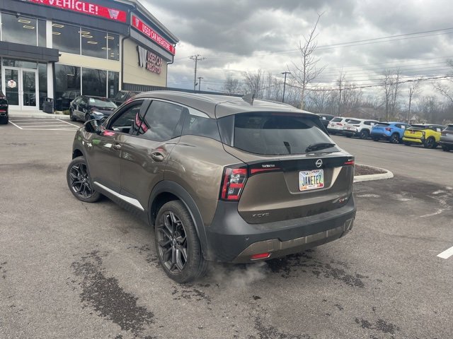 Jeff Wyler Eastgate Auto Mall is excited to offer this great-looking 2025 Nissan Kicks SR in Canyon Bronze Metallic. Well equipped with: SR Premium Package (Bose 10 -Speaker Audio, Driver Seat-Mounted Supplemental Air Bag, Heated Front Seats, Heated Steering Wheel, Panoramic Moonroof, Rain Sensing Wipers, and Remote Engine Start), 17" Alloy Wheels, 4-Wheel Disc Brakes, 6 Speakers, ABS brakes, Air Conditioning, Alloy wheels, AM/FM radio: Sirius, Auto High-beam Headlights, Automatic temperature control, Brake assist, Bumpers: body-color, Carpeted Floor Mats, Delay-off headlights, Door Trim Panel Scuff Plates, Driver door bin, Driver vanity mirror, Dual front impact airbags, Dual front side impact airbags, Electronic Stability Control, Four wheel independent suspension, Front anti-roll bar, Front Bucket Seats, Front Center Armrest, Front reading lights, Fully automatic headlights, Heated door mirrors, Illuminated entry, Knee airbag, Leather Shift Knob, Leather steering wheel, Low tire pressure warning, Occupant sensing airbag, Outside temperature display, Overhead airbag, Overhead console, Panic alarm, Passenger door bin, Passenger vanity mirror, Power door mirrors, Power steering, Power windows, Radio data system, Radio: AM/FM Audio System, Rear anti-roll bar, Rear reading lights, Rear seat center armrest, Rear side impact airbag, Rear window defroster, Rear window wiper, Remote keyless entry, Security system, Speed control, Speed-sensing steering, Split folding rear seat, Spoiler, Sport Cloth/Leatherette Seat Trim, Sport steering wheel, Steering wheel mounted audio controls, Tachometer, Telescoping steering wheel, Tilt steering wheel, Traction control, Trip computer, Turn signal indicator mirrors, Variably intermittent wipers, Wheels: 19" Dark Gray Alloy, and Wireless Apple CarPlay/Wireless Android Auto. CARFAX One-Owner. Clean CARFAX. Ask about available certifications. Used vehicles 10 years of age or newer with less than 100,000 miles are eligible for the Wyler Assurance Program, but eligible vehicles must pass our reconditioning process and multi-point inspection. Provided the vehicle passes inspection, vehicles will be eligible for the 6 month/6,000 mile limited warranty. The 6 month/6,000 mile limited warranty is NOT available on AS-IS vehicles, wholesale vehicles, lease buyback/pass-thru vehicles or un-inspected vehicles. Note that this program can also apply to vehicles where the remaining factory coverage is less than 6 months or 6,000 miles. Please check the Federal Trade Commission (FTC) Buyers guide on the vehicle for full details as to whether or not warranty coverage may apply. Contact Dealer for additional details. The Wyler Assurance 6 month/6,000 Mile limited warranty ends 6 months from the date of the Retail Purchase Agreement (BUYERS ORDER) or when the vehicle's odometer registers 6,000 additional miles to the mileage listed on the BUYERS ORDER, whichever comes first. Your Deductible - The warranty holder on your contract pays the first $100 of each covered repair.