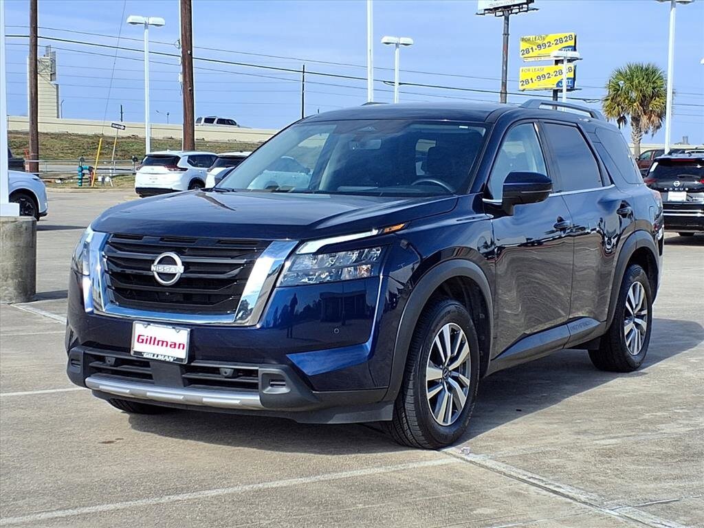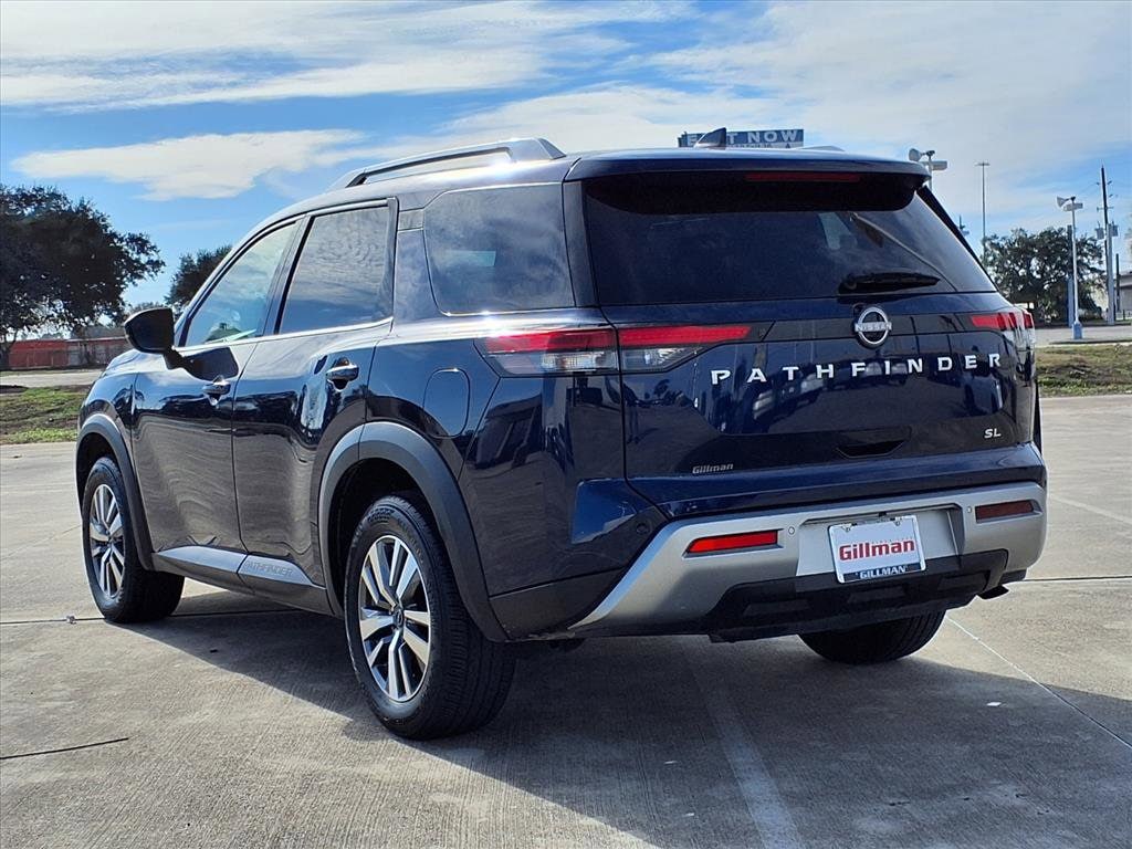 Gillman's Lifetime Engine Warranty lasts as long as you own your vehicle - free with the Gillman Pre-Owned Promise. If the vehicle isn't right for you, return it in purchase condition within 2 days or 200 miles as part of our Happy-Driving Guarantee. Experience the perfect blend of style, comfort, and advanced technology with this Blue 2025 Nissan Pathfinder SL SUV. Powered by a robust 3.5L V6 engine paired with a smooth 9-speed shiftable automatic transmission and efficient FWD, the Pathfinder offers a dynamic and comfortable ride for families and adventurers alike. Enjoy premium features like leather-trimmed upholstery, a heated steering wheel, heated front seats, and a power-operated rear liftgate for added convenience. Stay connected with a 9-inch infotainment screen, wireless Apple CarPlay, Android Auto, NissanConnect, and Wi-Fi hotspot capability. Safety is a priority with adaptive cruise control, lane keeping assist, blind spot monitoring, rear cross traffic alert, front and rear automatic emergency braking, and a surround view camera system. The spacious interior includes reclining second and third-row seats, tri-zone automatic climate control, and multiple USB/USB-C outlets for every passenger. With striking LED headlights, aluminum alloy wheels, and silver roof rails, this Pathfinder SL stands out wherever you go.