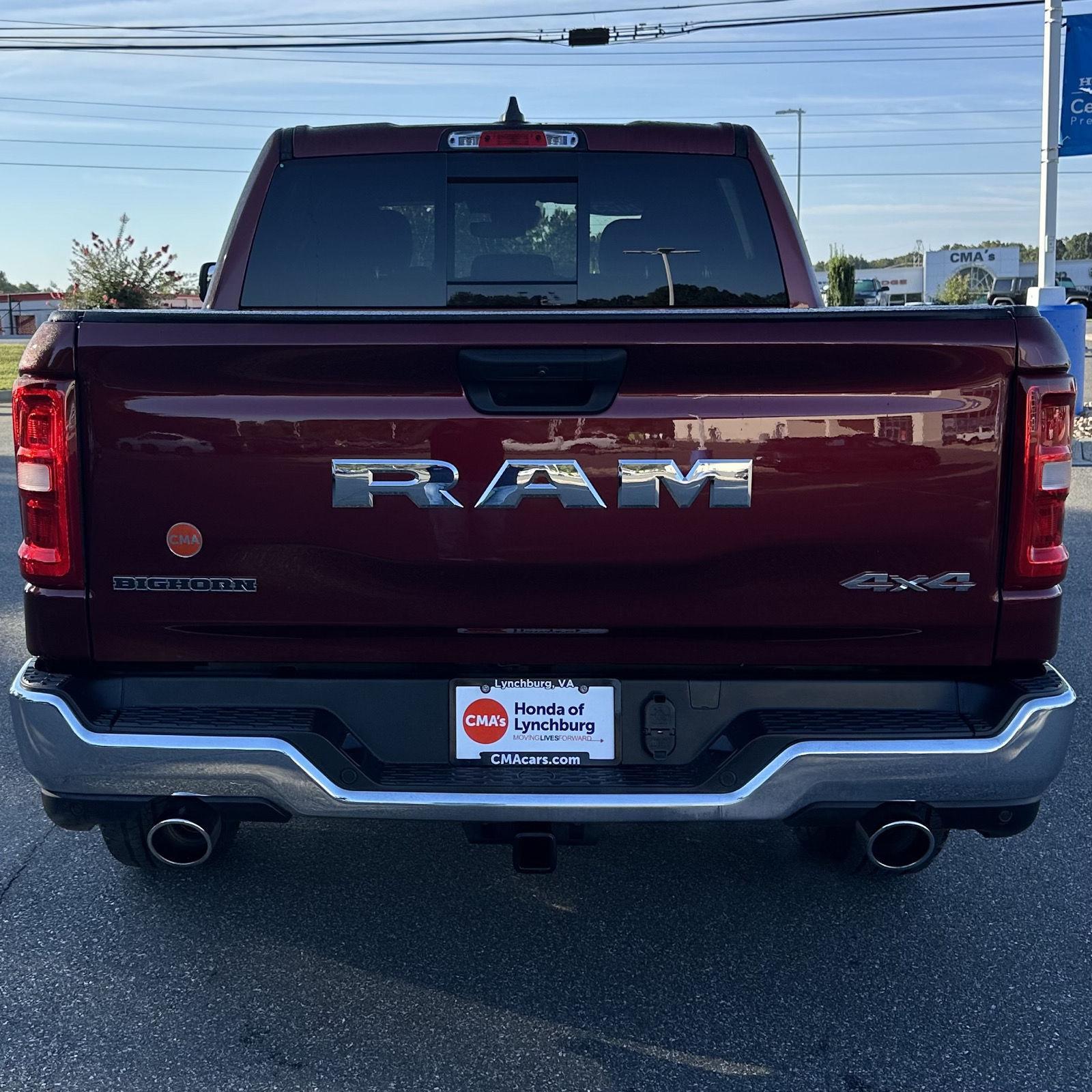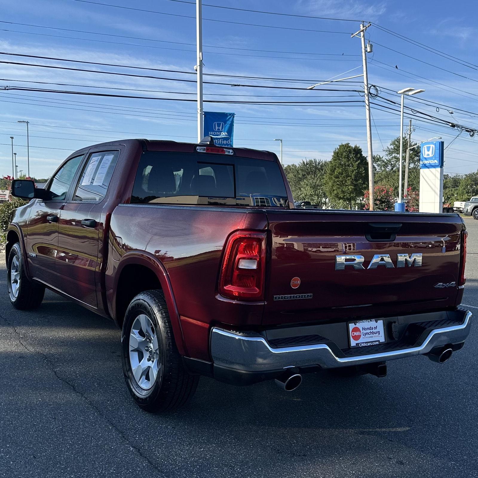 Thank you for choosing CMA's Honda of Lynchburg, this Delmonico Red Pearlcoat 2025 Ram 1500 Big Horn is a great choice! Check out the following: No Accidents! One Owner! City 17/ Hwy 24. Quick Order Package 21Z Big Horn. Big Horn Level 1 Equipment Group ($1,695 value). To be sure you don't miss out, give us a call at and schedule a test drive. We are located at 2634 Lakeside Drive Lynchburg VA 24501. We look forward to seeing you soon!