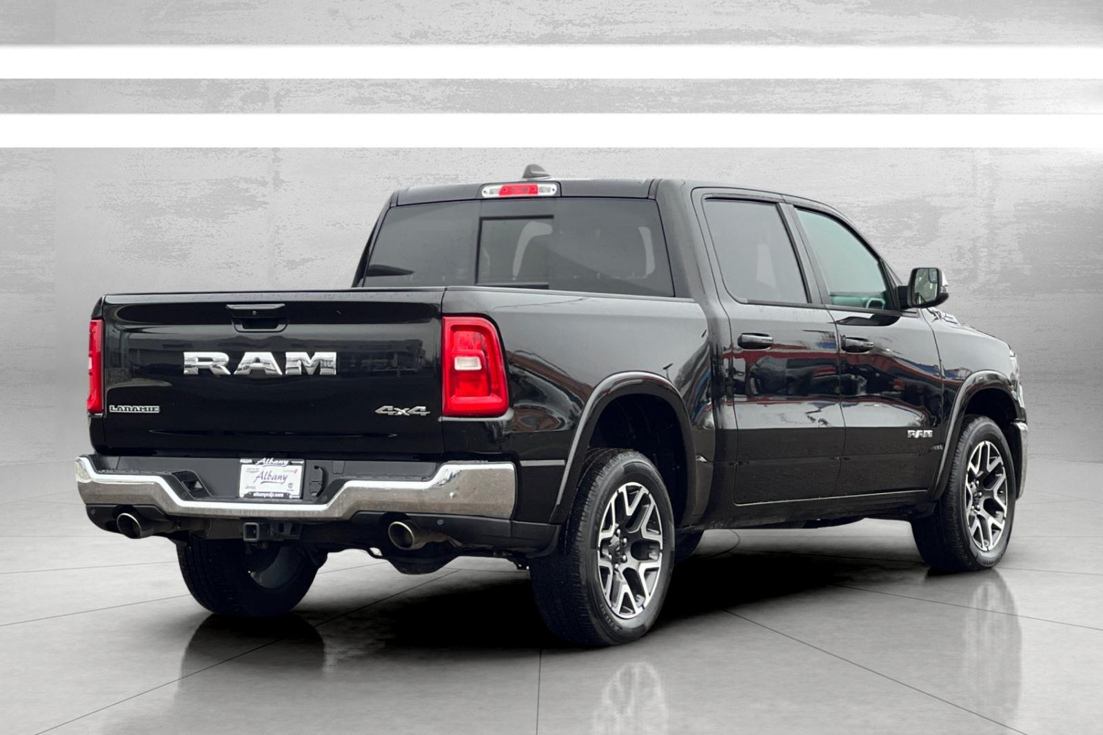 Diamond Black Crystal Pearlcoat 2025 Ram 1500 Laramie 17/24 City/Highway MPG Recent Arrival! CARFAX One-Owner. 1500 Laramie, 4D Crew Cab, 3.0L I6, 8-Speed Automatic, 4WD, Diamond Black Crystal Pearlcoat, Black Leather, 10 Speakers, 3 Rear Seat Head Restraints, 3.55 Rear Axle Ratio, 4 Way Front Headrests, 4G LTE Wi-Fi Hot Spot, ABS brakes, Air Conditioning, Alloy wheels, AM/FM radio: SiriusXM with 360L, Apple CarPlay, Apple CarPlay/Android Auto, Audio memory, Auto High-beam Headlights, Auto Power-Folding Mirrors, Auto-dimming door mirrors, Auto-Dimming Exterior Driver Mirror, Auto-dimming Rear-View mirror, Automatic temperature control, Brake assist, Bumpers: chrome, Chrome Exterior Mirrors, Compass, Connected Travel & Traffic Services, Connectivity - US/Canada, Convex Wide-Angle Exterior Mirror Insert, Delay-off headlights, Driver door bin, Driver Seat Memory, Driver vanity mirror, Dual front impact airbags, Dual front side impact airbags, Electronic Stability Control, Exterior Mirrors Courtesy Lamps, Exterior Mirrors w/Heating Element, Exterior Mirrors w/Memory, Exterior Mirrors w/Supplemental Signals, Front anti-roll bar, Front Center Armrest w/Storage, Front dual zone A/C, Front fog lights, Front License Plate Bracket, Front reading lights, Front Seat Back Map Pockets, Front wheel independent suspension, Fully automatic headlights, Garage door transmitter, Google Android Auto, GPS Antenna Input, GPS Navigation, HD Radio, Heated door mirrors, Heated Front Seats, Heated front seats, Heated rear seats, Heated Steering Wheel, Heated steering wheel, Illuminated entry, Integrated Voice Command w/Bluetooth, Laramie Level 1 Equipment Group, Leather steering wheel, Leather Trim 40/20/40 Bench Seat, Low tire pressure warning, Manufacturer's Statement of Origin, Memory seat, Navigation System, Occupant sensing airbag, Outside temperature display, Overhead airbag, Overhead console, Panic alarm, ParkView Rear Back-Up Camera, Passenger door bin, Passenger vanity mirror.