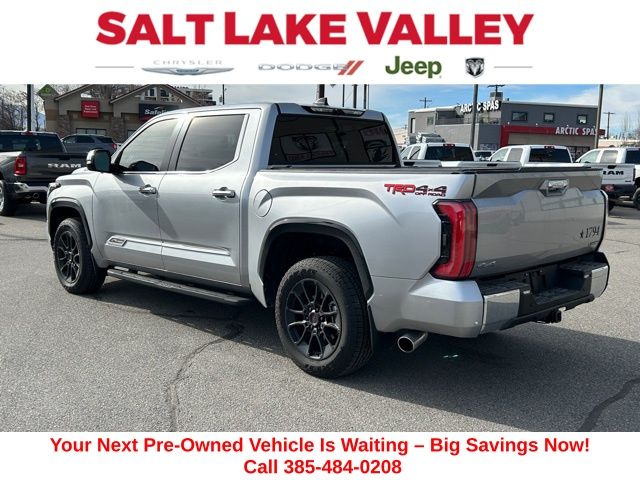 Get ready to hit the road in this Toyota Tundra Hybrid, a standout choice for drivers looking for reliability, performance, and style! This impressive vehicle is packed with premium features designed to make every drive more enjoyable. Plus, you’ll enjoy a $1,000 finance savings, already included in the sale price, when you finance through one of our trusted lending partners. Whether you’re searching for used cars in Salt Lake City, a dependable SUV, or a powerful truck, this Toyota Tundra Hybrid delivers everything you need and more. Visit Salt Lake Valley Chrysler Dodge Jeep Ram today to test drive or explore our entire selection of quality pre-owned vehicles. Don’t wait - shop online at www.slvcdjr.com or call 801-484-8755 to learn more! This amazing vehicle comes loaded with options like 12 Speakers, 3.31 Axle Ratio, 4-Wheel Disc Brakes, ABS brakes, Air Conditioning, Alloy wheels, AM/FM radio: SiriusXM, Apple CarPlay/Android Auto, Auto High-beam Headlights, Auto-dimming door mirrors, Auto-dimming Rear-View mirror, Automatic temperature control, Brake assist, Bumpers: body-color, Delay-off headlights, Driver door bin, Driver vanity mirror, Dual front impact airbags, Dual front side impact airbags, Electronic Stability Control, Emergency communication system: Safety Connect (10-year trial), Exterior Parking Camera Rear, Front anti-roll bar, Front Bucket Seats, Front Center Armrest, Front dual zone A/C, Front fog lights, Front reading lights, Front wheel independent suspension, Fully automatic headlights, Garage door transmitter: HomeLink, Heated & Ventilated Front Bucket Seats, Heated door mirrors, Heated front seats, Heated rear seats, Heated steering wheel, Illuminated entry, Knee airbag, Leather Shift Knob, Leather steering wheel, Low tire pressure warning, Memory seat, Navigation System, Occupant sensing airbag, Outside temperature display, Overhead airbag, Overhead console, Panic alarm, Passenger door bin, Passenger vanity mirror, Power door mirrors, Power driver seat, Power moonroof, Power passenger seat, Power steering, Power windows, Premium Leather Seat Trim, Radio data system, Radio: Premium Audio w/JBL, Rain sensing wipers, Rear reading lights, Rear seat center armrest, Rear step bumper, Rear window defroster, Remote keyless entry, Security system, Speed control, Speed-sensing steering, Split folding rear seat, Steering wheel memory, Steering wheel mounted audio controls, Tachometer, Telescoping steering wheel, Tilt steering wheel, Traction control, Trip computer, Turn signal indicator mirrors, Variably intermittent wipers, Ventilated front seats, Ventilated rear seats, Voltmeter, and Wheels: 20" x 8" Machined-Finish Alloy, making it the perfect choice for your next adventure. Odometer is 5779 miles below market average! CARFAX One-Owner. Peace of mind. Vehicle history report. Title information. Odometer readings. Accident data (if applicable). Service history. Vehicle usage. Recall information (if applicable). Warranty status. Free CarFax report. A name you can trust.