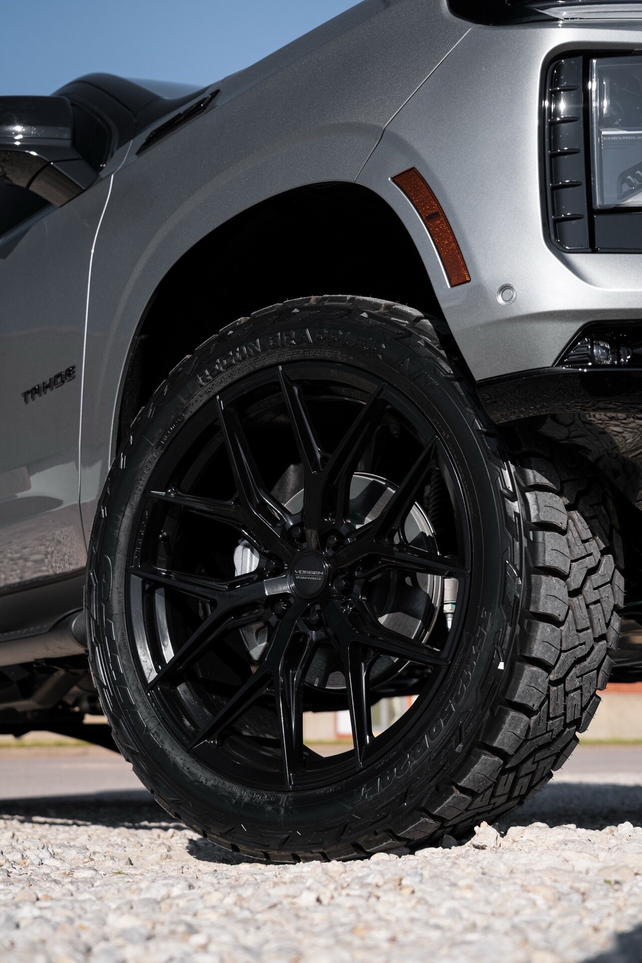 Autoplex Customs lifted Tahoe Z71 6.2L! 24'' Voseen wheels, custom air ride lift kit, Nito Recon grappler 35x12.50R24 MT tires, black out with roof wrap! Recent arrival! Sterling Gray Metallic.