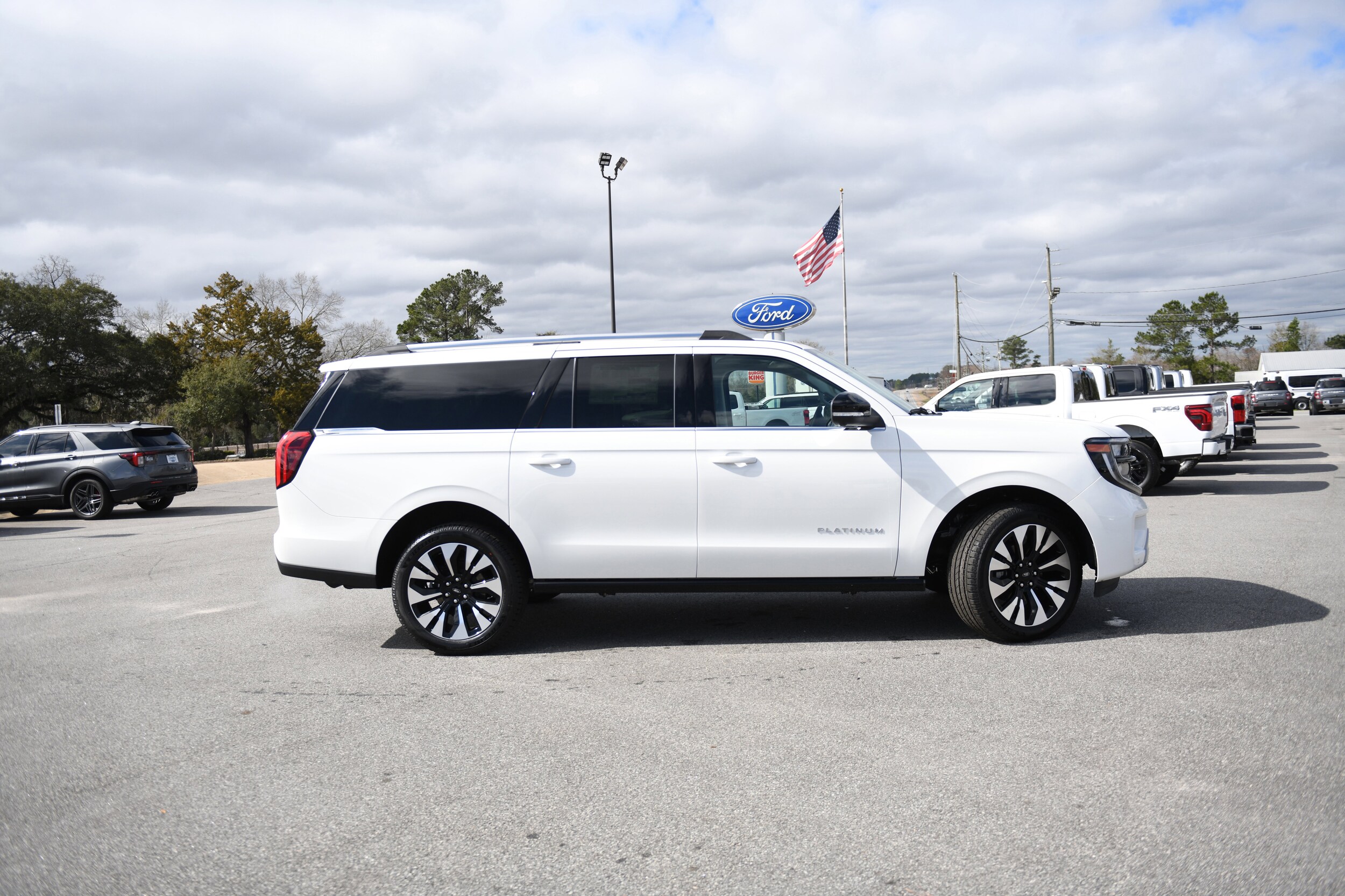 Star White Metallic Tri-Coat 2026 Ford Expedition Max Platinum 4WD 10-Speed Automatic EcoBoost 3.5L V6 GTDi DOHC 24V Twin Turbocharged. Driver's Package (Radio: B&O Play Unleashed), Equipment Group 600A Standard Package (2nd Row Power-Folding Captain's Chairs, 3.73 Axle Ratio, BlueCruise Equipped (90-Day Trial), Heated and Ventilated Leather Front Captain's Chairs, and Power Tilt/Telescopic Steering Wheel with Memory), Apple CarPlay/Android Auto, Auto High-beam Headlights, Black Onyx Painted Power Deployable Running Boards, Exterior Parking Camera Rear, Front Bucket Seats, Front dual zone A/C, Heated front seats, Heated rear seats, Heated steering wheel, Memory seat, Power driver seat, Power passenger seat, Rear air conditioning, SiriusXM with 360L (3-Year Plan), Ventilated front seats, Wheels: 22" x 9.0" Ebony Bright Machined Face Aluminum, 3rd row seats: split-bench, 4-Wheel Disc Brakes, ABS brakes, Air Conditioning, AM/FM radio: SiriusXM with 360L, Auto-dimming door mirrors, Auto-dimming Rear-View mirror, Automatic temperature control, Brake assist, Bumpers: body-color, Compass, Delay-off headlights, Driver door bin, Driver vanity mirror, Dual front impact airbags, Dual front side impact airbags, Electronic Stability Control, Emergency communication system: 911 Assist, Four wheel independent suspension, Front and 2nd Rows Floor Liners Without Carper Mats, Front anti-roll bar, Front Center Armrest, Front License Plate Bracket, Front reading lights, Fully automatic headlights, Garage door transmitter, Genuine wood dashboard insert, Genuine wood door panel insert, Heated door mirrors, Illuminated entry, Intersection Assist, Leather steering wheel, Low tire pressure warning, Navigation System, Occupant sensing airbag, Outside temperature display, Overhead airbag, Overhead console, Panic alarm, Passenger door bin, Passenger vanity mirror, Power door mirrors, Power moonroof: Vista Roof, Power steering, Power windows, Radio data system, Rain sensing wipers, Rear anti-roll bar, Rear reading lights, Rear window defroster, Rear window wiper, Reclining 3rd row seat, Remote keyless entry, Security system, Speed control, Speed-sensing steering, Speed-Sensitive Wipers, Split folding rear seat, Spoiler, Steering wheel memory, Steering wheel mounted audio controls, Tachometer, Telescoping steering wheel, Tilt steering wheel, Traction control, Trip computer, Turn signal indicator mirrors, Variably intermittent wipers.