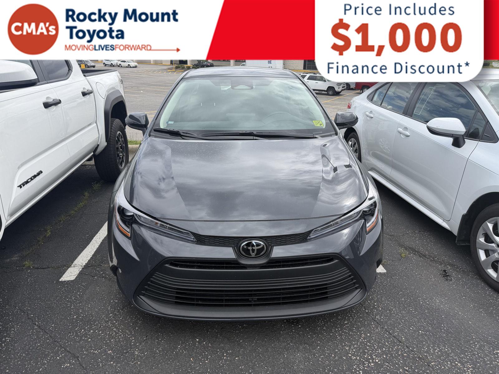Thank you for choosing CMA's Rocky Mount Toyota, this Underground 2026 Toyota Corolla LE is a great choice! Check out the following: No Accidents! City 32/ Hwy 41. Includes front and rear mudguards. Underground, Black, fabric seat trim. At Rocky Mount Toyota we believe in LIVE MARKET PRICING on all vehicles in our inventory. We use real-time market price comparisons to constantly adjust prices to provide all buyers the best value price possible. Pricing includes $1,000 dealer financing discount. Customer must finance with dealer through in house finance partners, or add back the $1,000 for any outside liens or cash purchases. Pricing excludes tax, tags, doc fee, and dealer added accessories. All vehicles are sold on a first come first serve basis due to multiple people interested in the same vehicles without prior knowledge.