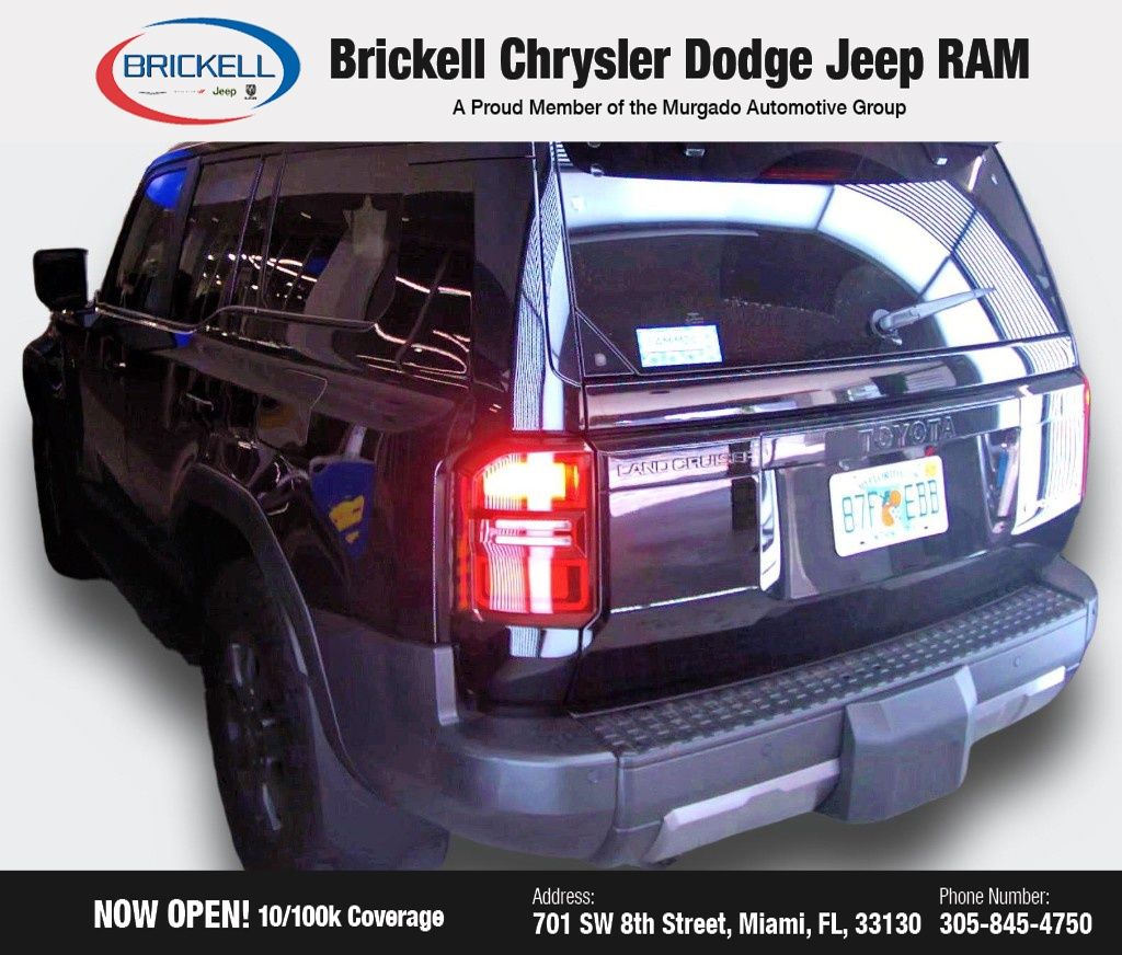 Introducing the 2026 Toyota Land Cruiser Base - a true icon of off-road capability and refined luxury. This exceptional pre-owned SUV is now available at Brickell CDJR, and it's ready to elevate your driving experience. Boasting a sleek black exterior, the 2026 Land Cruiser Base comes equipped with a range of impressive features that set it apart. Powered by a robust 2.4L 4-Cylinder engine paired with an 8-Speed Automatic transmission and 4WD, this Land Cruiser delivers exceptional performance and capability. With an impressive 22 city MPG and 25 highway MPG, you'll enjoy both power and efficiency. Step inside the spacious cabin and experience the unparalleled comfort and refinement of this pre-owned Land Cruiser. The description of this vehicle is a true gem that combines exceptional performance, uncompromising quality, and timeless style.